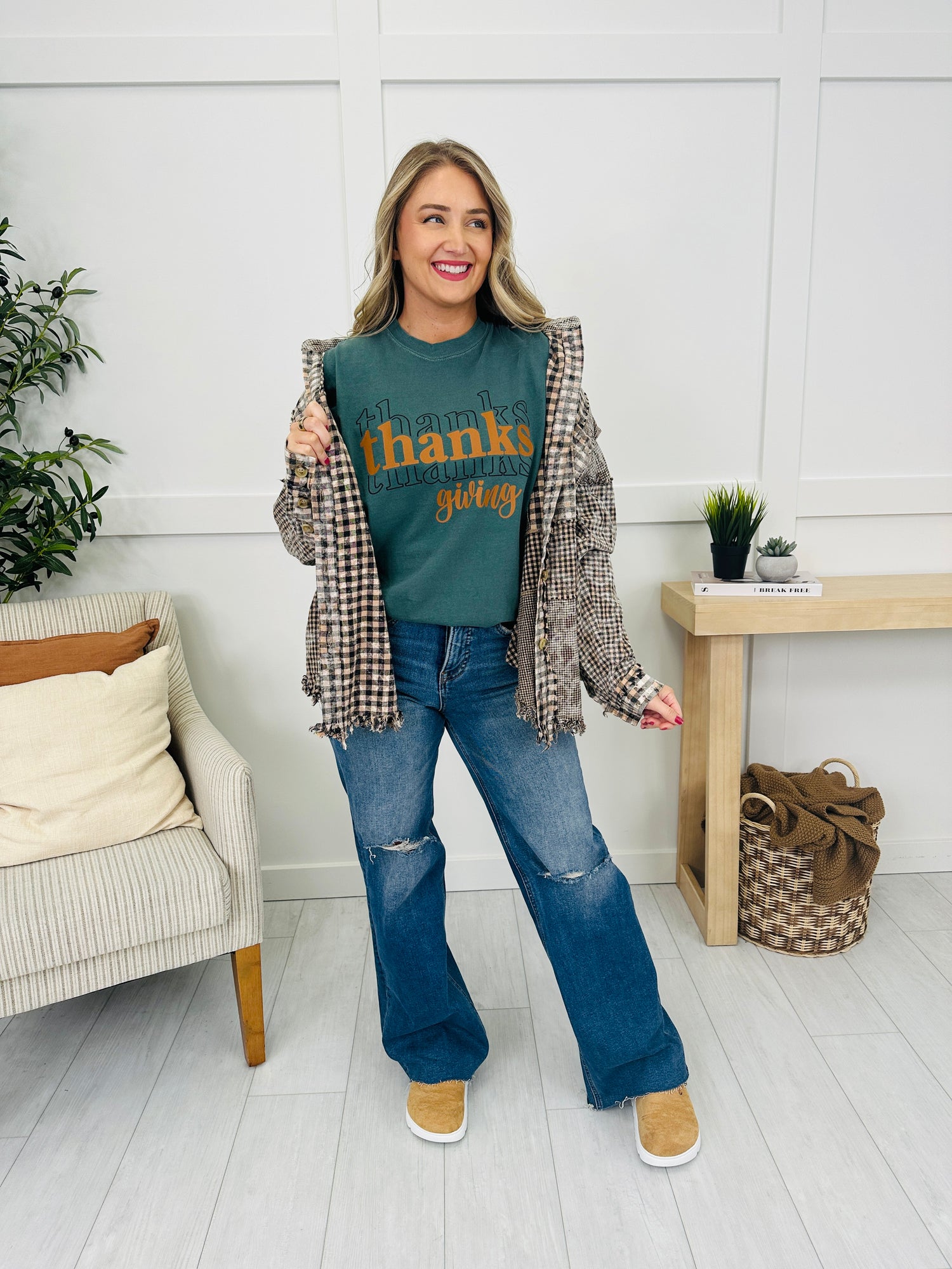 Give thanks in style this season with our new Thanksgiving Graphic Tee, available in two fall colors. This new arrival is screen printed in house for long lasting wear on Comfort Colors Tees. This best selling brand is known for being extra soft, making it perfect for all-day wear — from cooking in the kitchen to lounging after the feast.