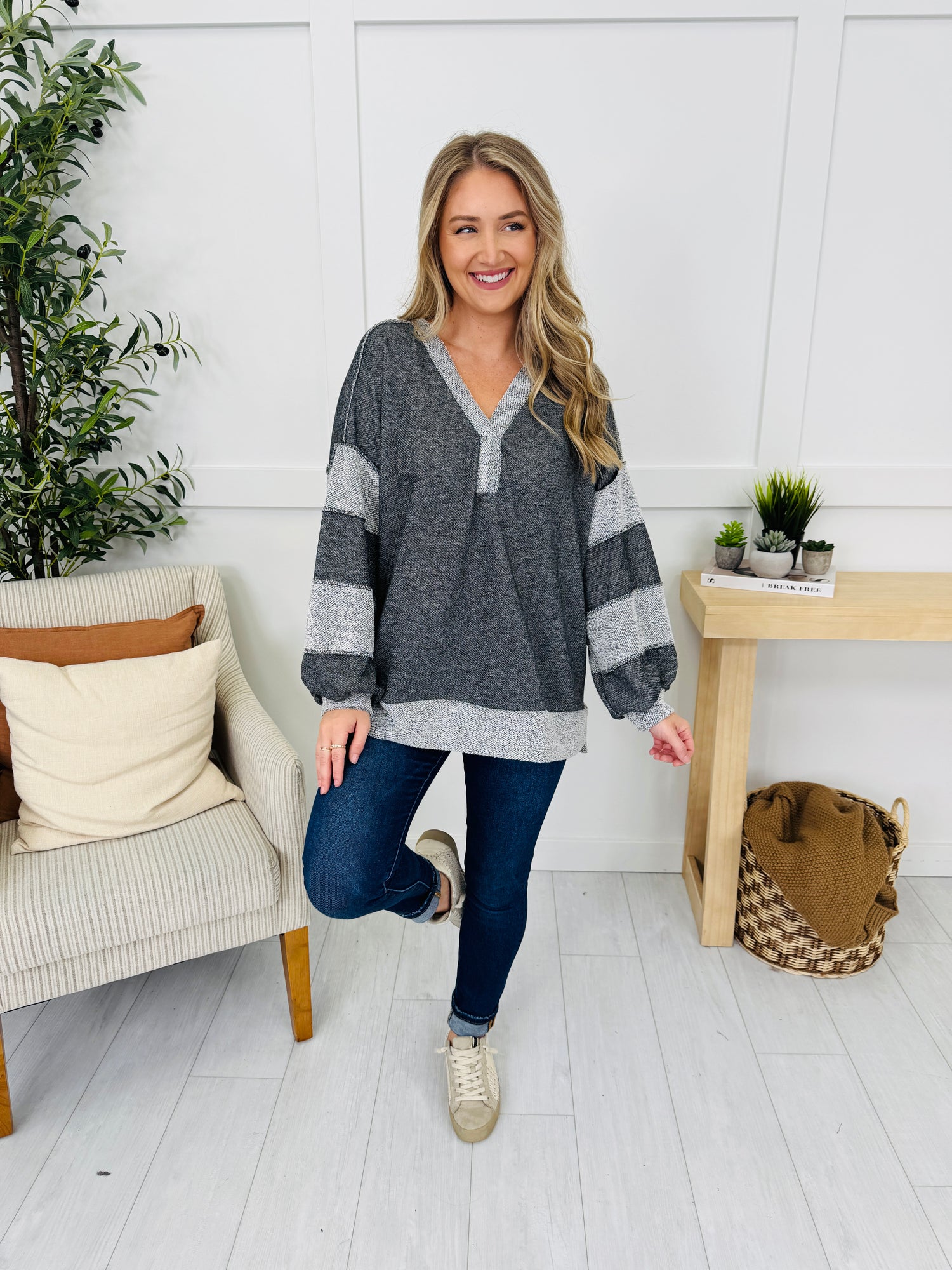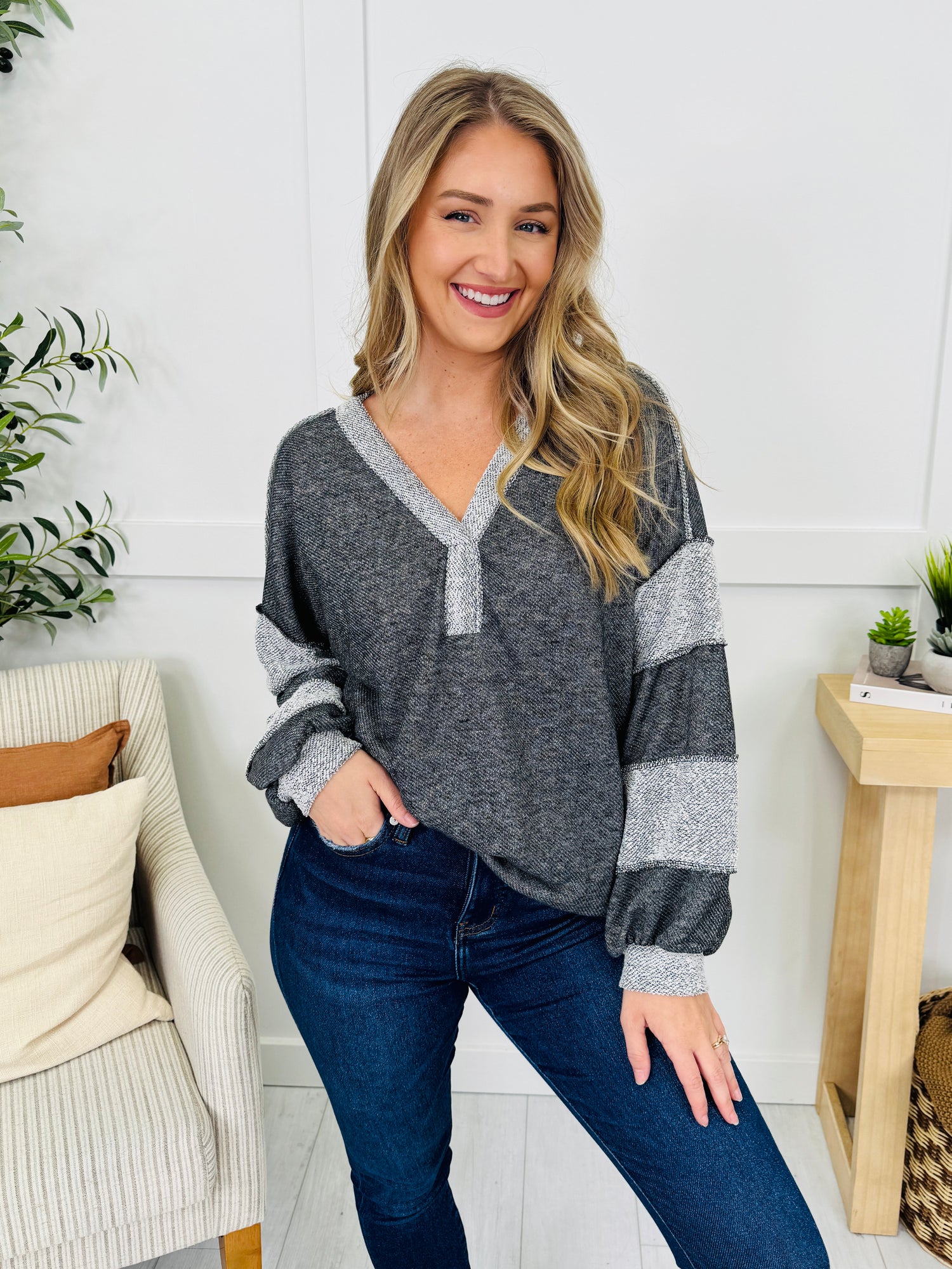 This top brings an easygoing yet chic vibe with its relaxed, flowy fit and soft knit fabric. The bold contrast trim along the neckline, sleeves, and hem adds just the right amount of detail to make it stand out. Perfect for lounging or casual days, this piece blends comfort with style effortlessly.