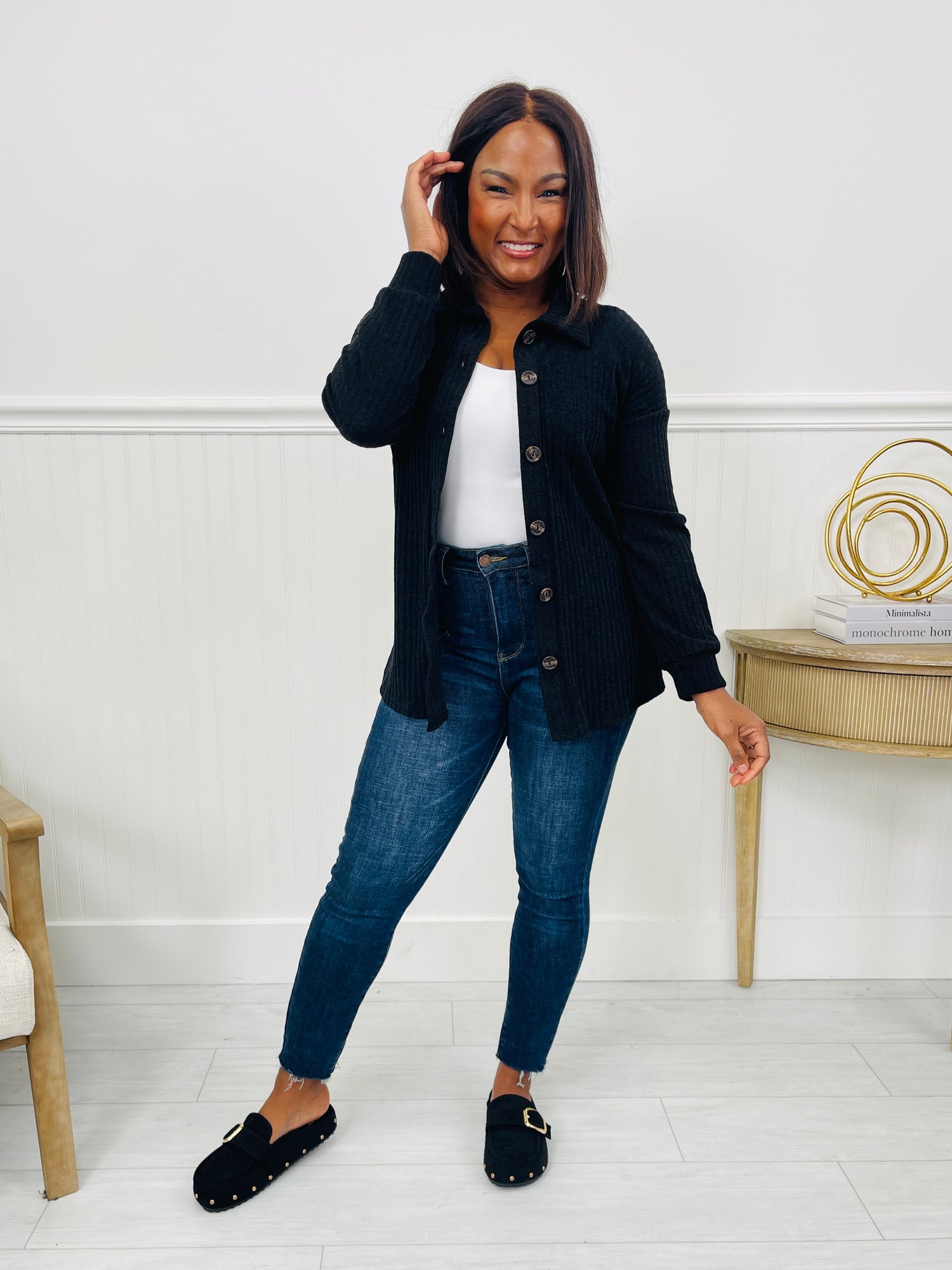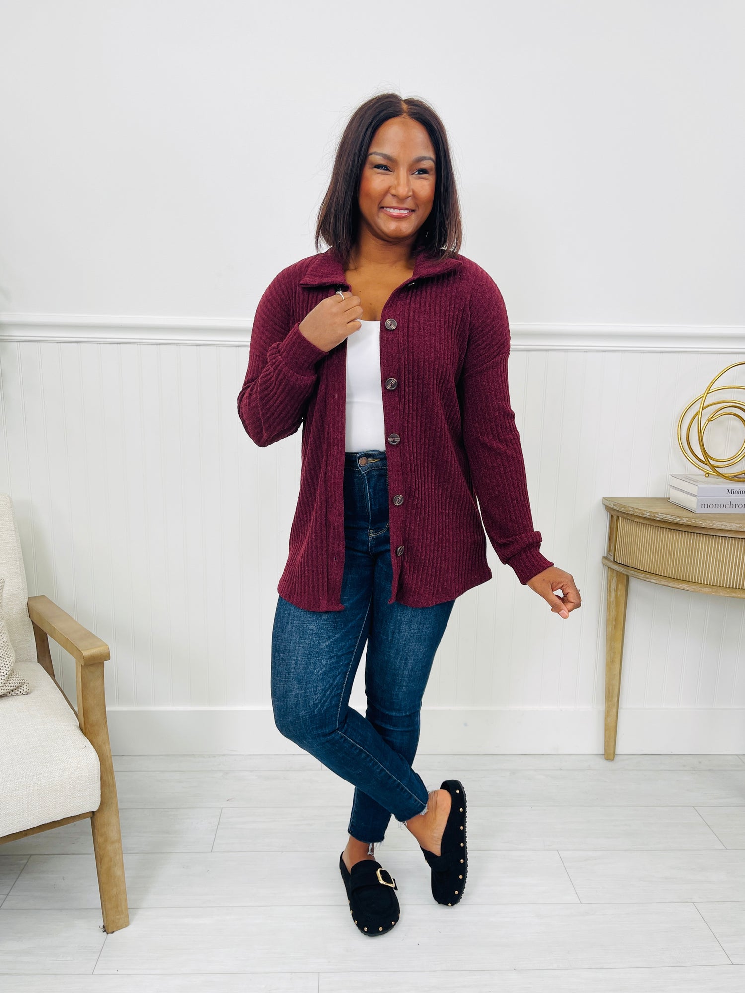 Effortlessly polished, this cardigan features a full button-front you can wear open or closed, framed by a crisp shirt-style collar. The vertical knit texture adds a refined look while the long sleeves with finished cuffs keep it cozy for everyday wear. Available in two rich and versatile colors, it’s an easy layer to pair with tees, tanks, and denim all season.
