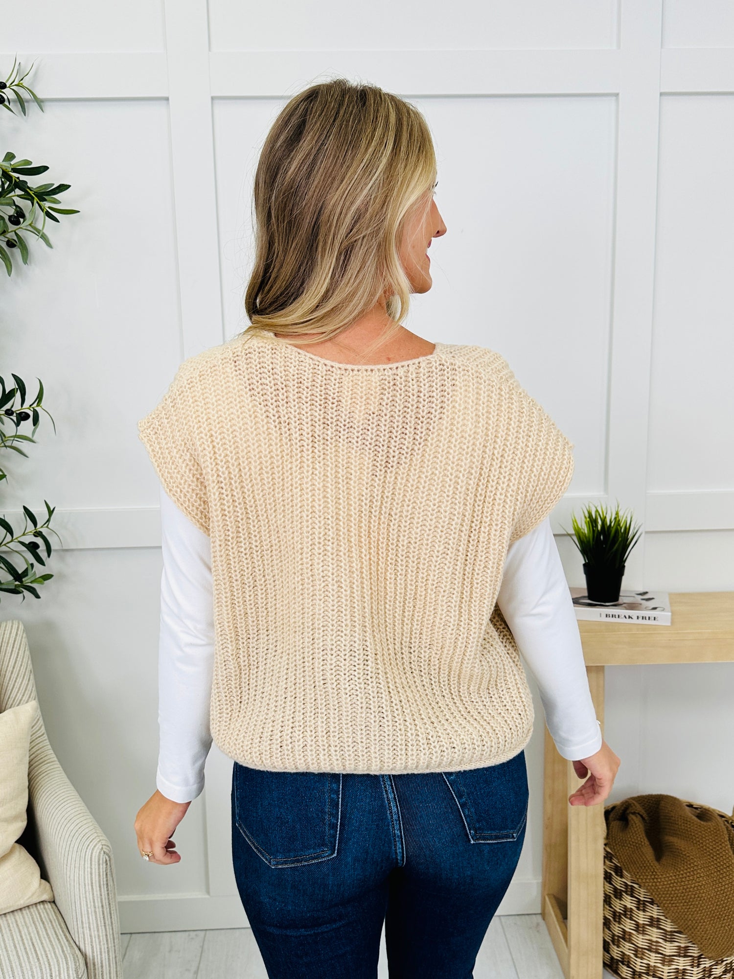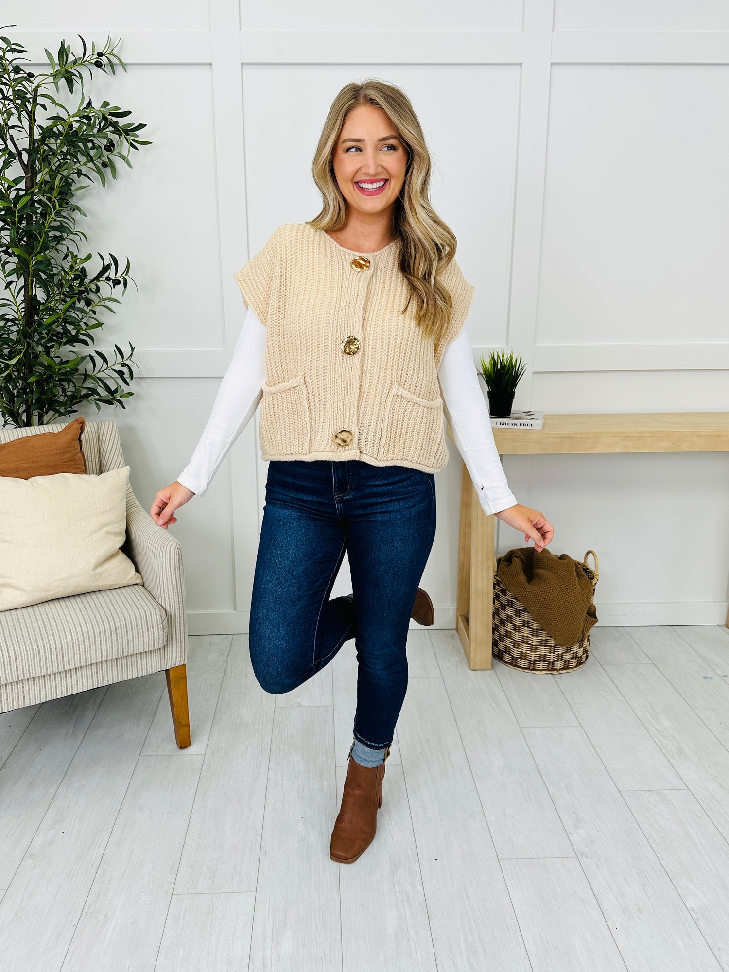 This cap-sleeved cardigan brings cozy style with its chunky knit texture and gold statement buttons that instantly catch the eye. The cap sleeve design keeps it playful and modern, while the front pockets add a touch of charm and functionality. Perfect for layering, this piece is a versatile staple that can dress up a simple look with ease.