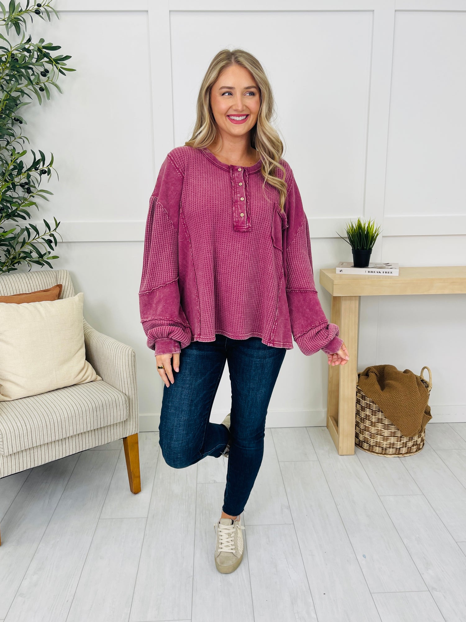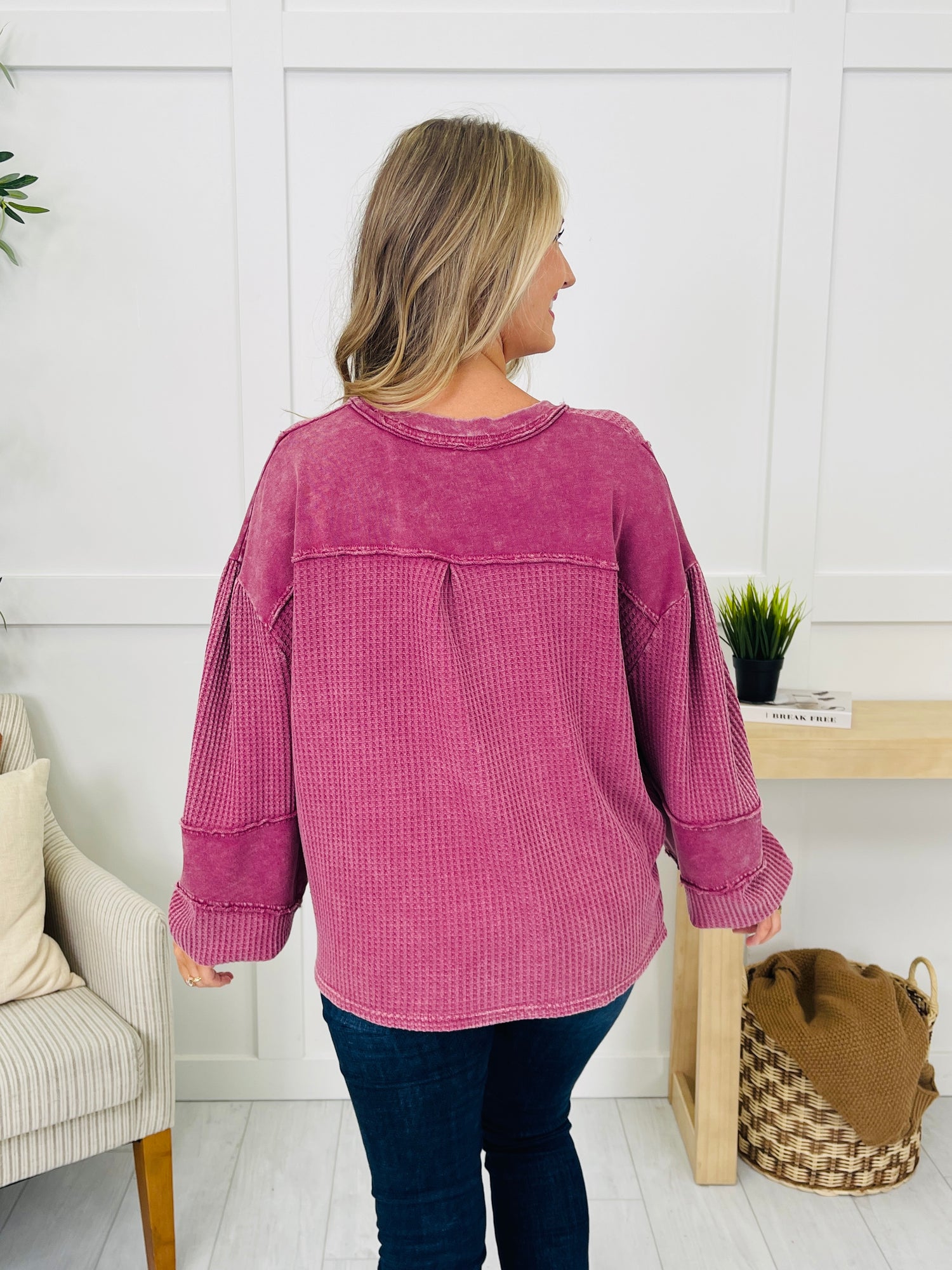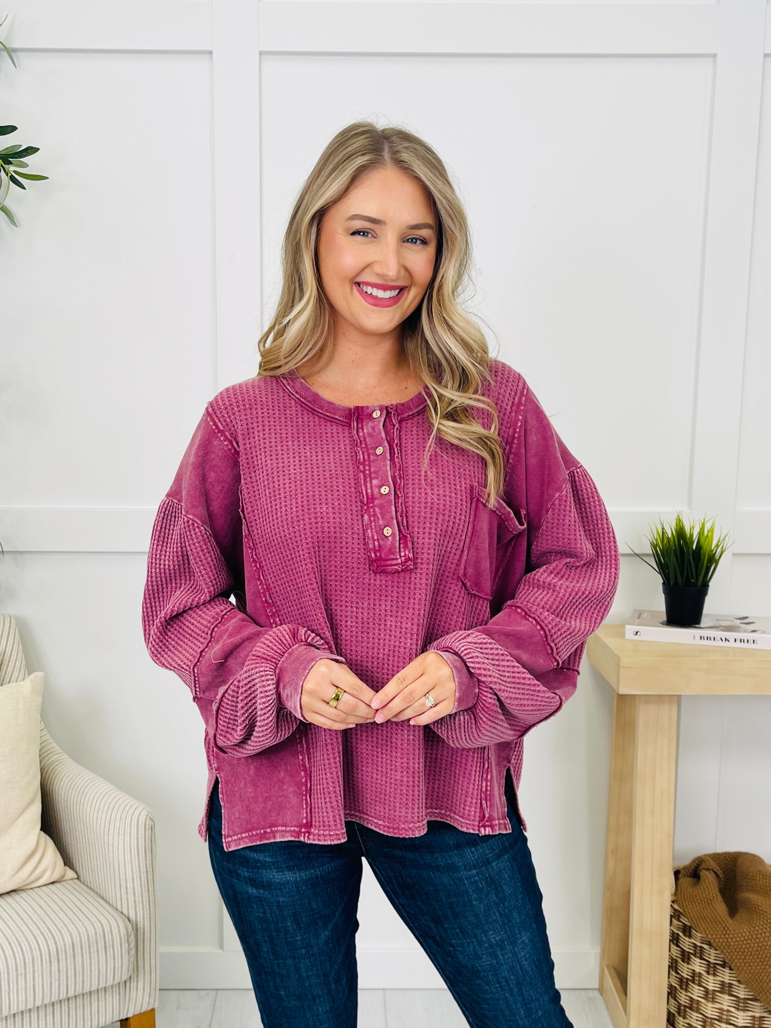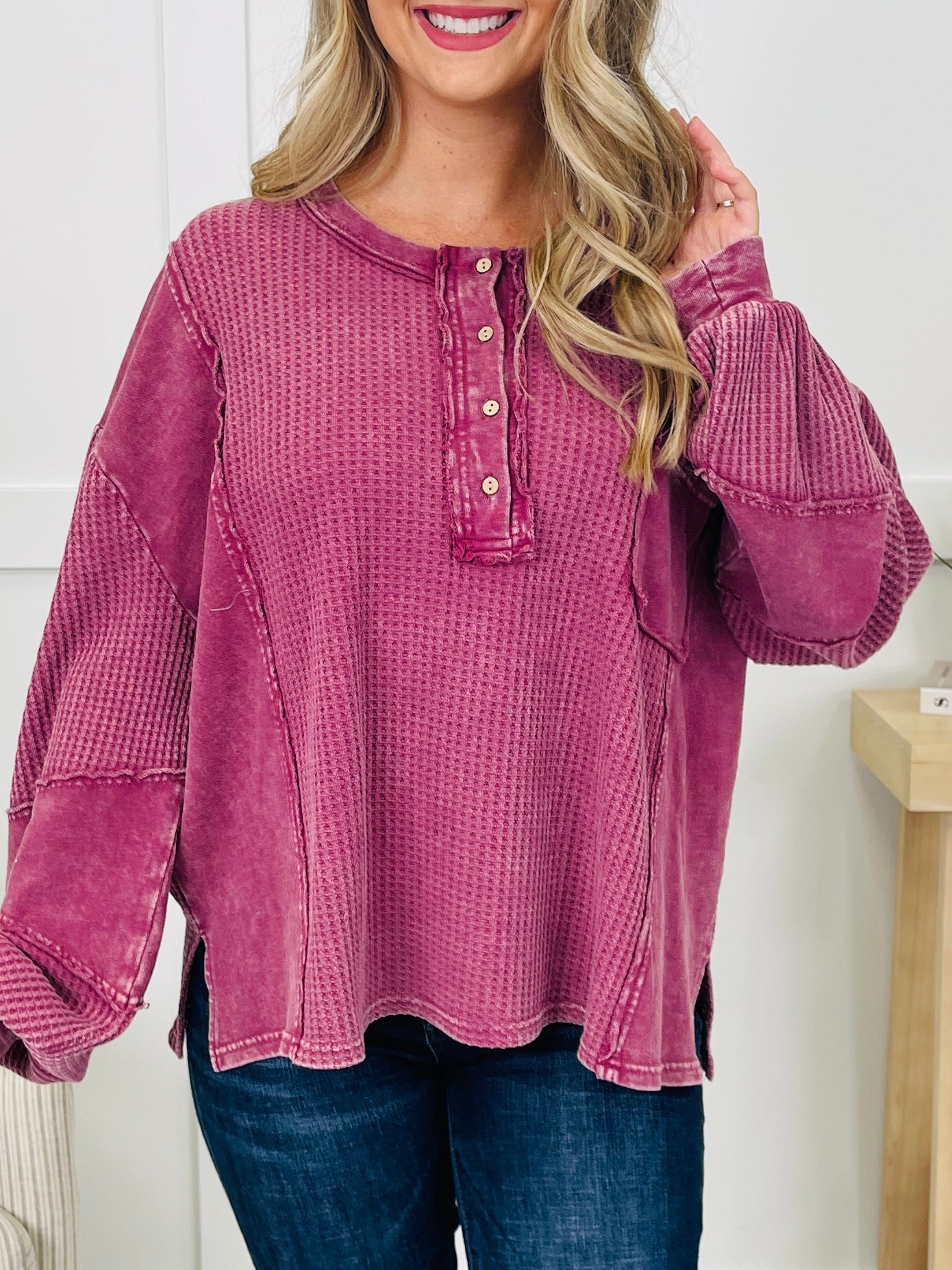 This top blends casual charm with standout detailing for a fresh, effortless look. The button front neckline adds a touch of versatility, while the exposed seam details give it a laid-back, lived-in vibe. A textured knit pattern brings added depth, complemented by soft panels for a unique mix of finishes that make this piece easy to style and wear on repeat.
