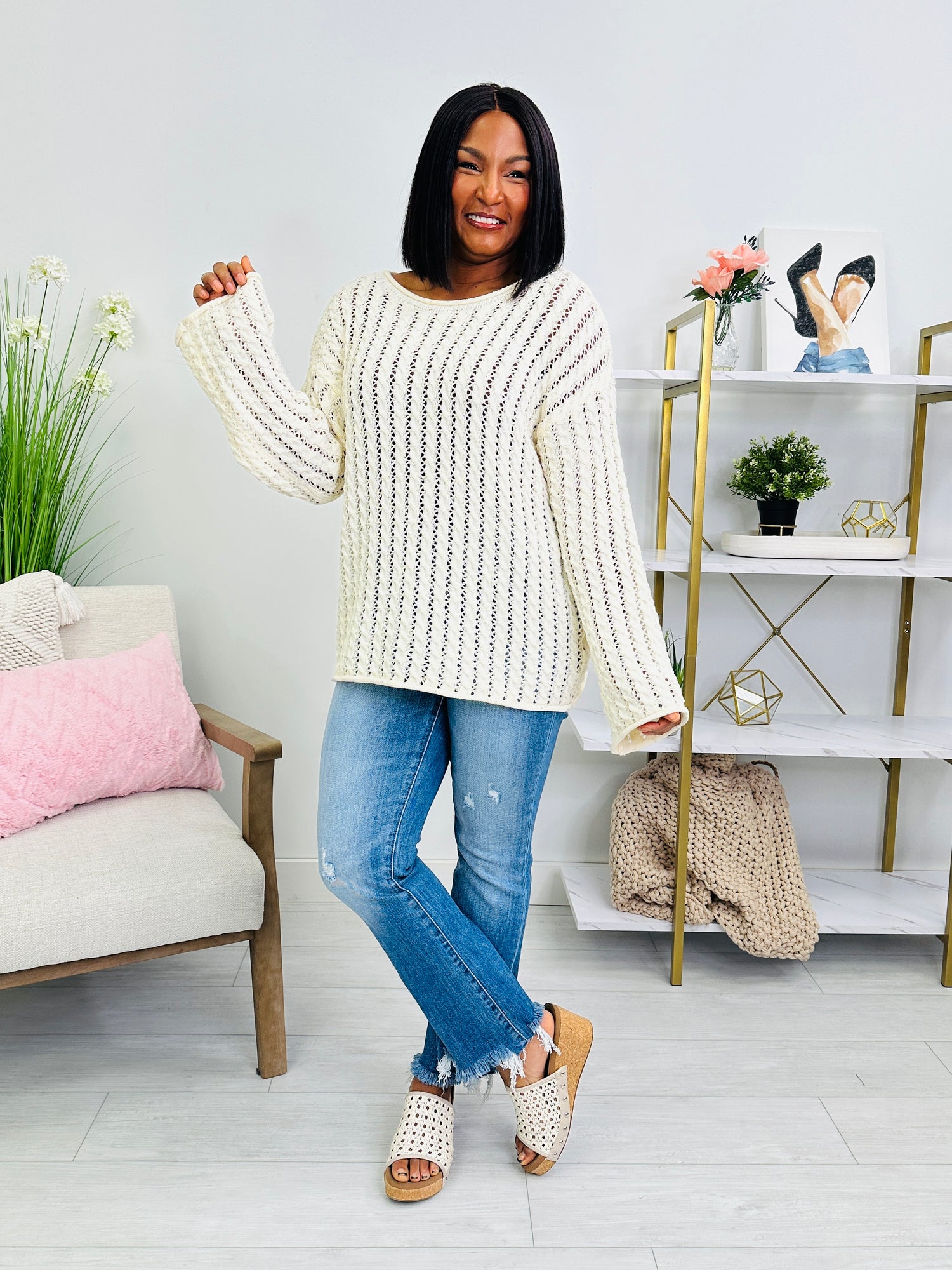 This open-knit sweater brings a cozy-meets-breezy feel with its airy texture and relaxed, easy fit that lays comfortably on the body. The wide, flowy sleeves add a soft, effortless silhouette that pairs perfectly with denim or leggings. Available in several colors, it’s a versatile staple for layering or wearing on its own throughout the season.