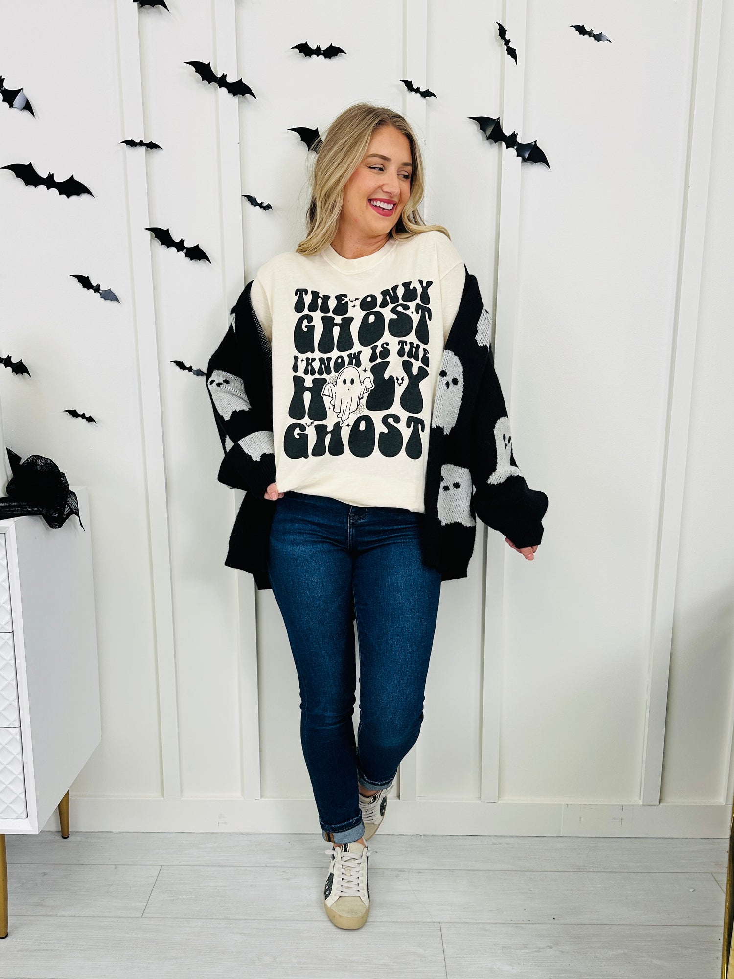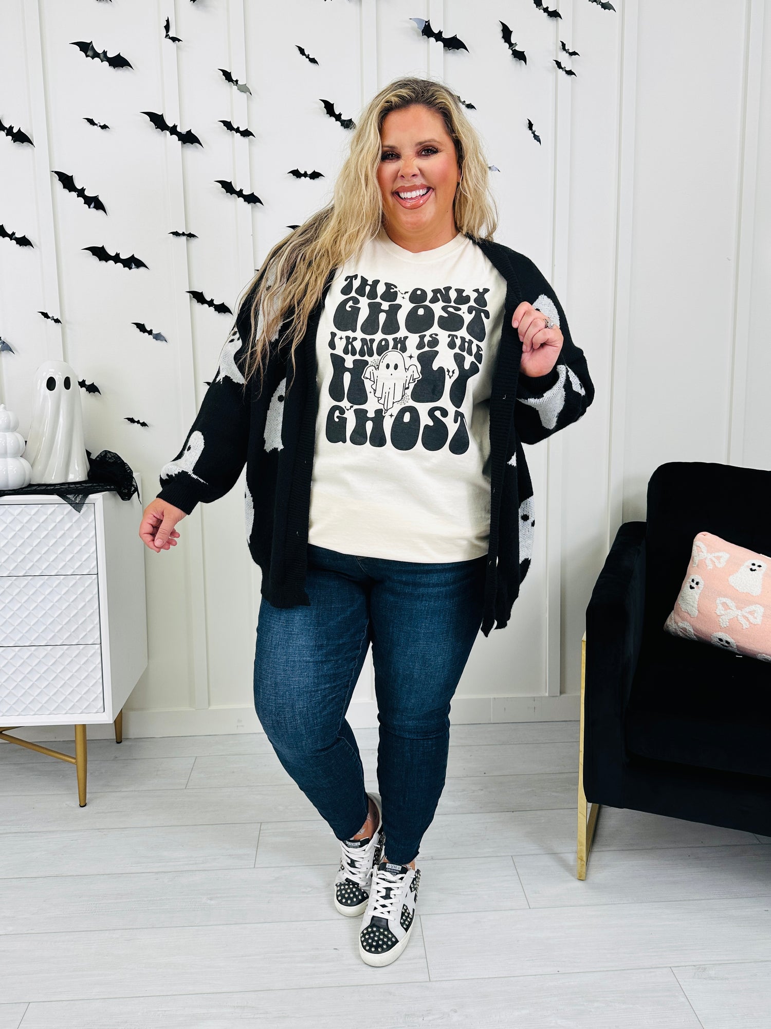 Faith meets festive in this new graphic tee. Featuring bold retro-style lettering and a playful ghost illustration, this tee is a fun reminder that the only ghost you need this season is the Holy Ghost. This tee is printed in house for long lasting wear on a comfort colors garment dyed tee. Be festive and spread the love of Jesus everywhere you go this season in this tee!