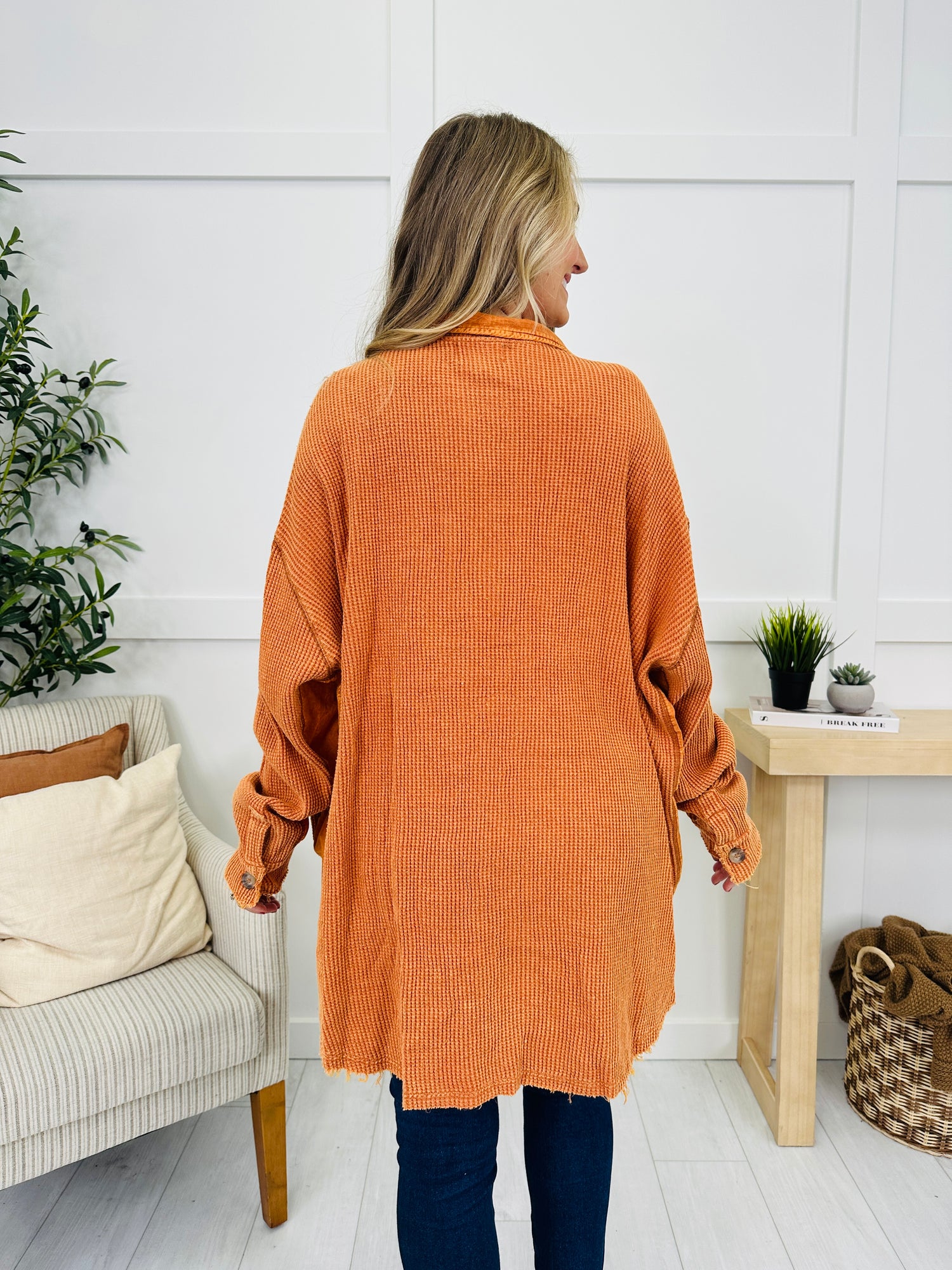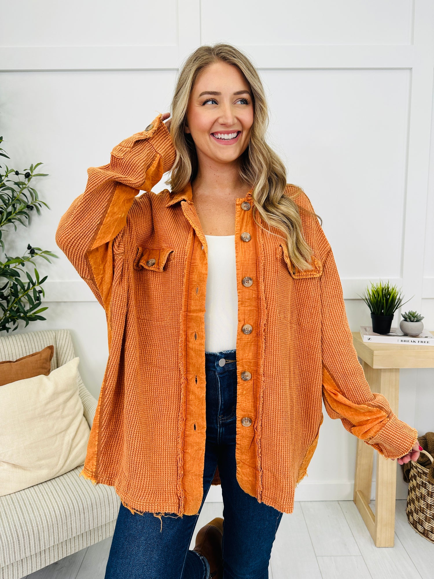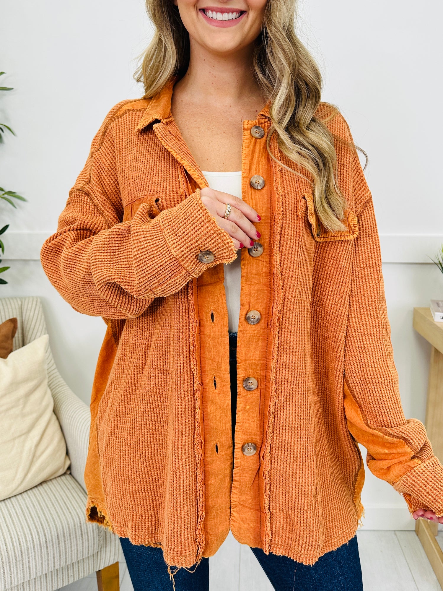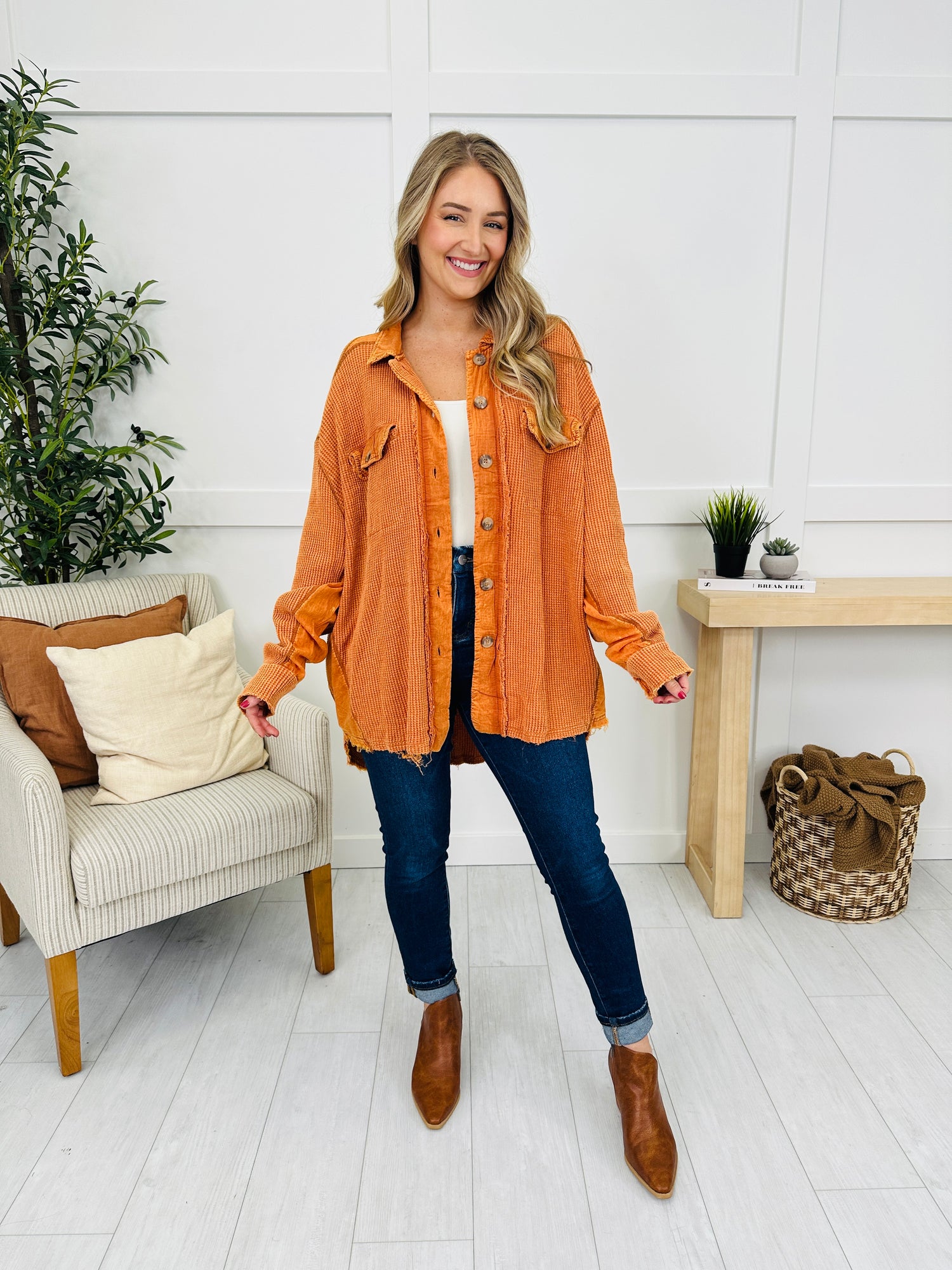 Effortlessly cool and perfectly seasonal, this top is all about those laid-back autumn vibes. It features a classic button front detail and a textured woven fabric that gives it a cozy, lived-in feel. Finished with lightly frayed edges for just the right amount of edge, this piece is a must-have for layering through fall and beyond.
