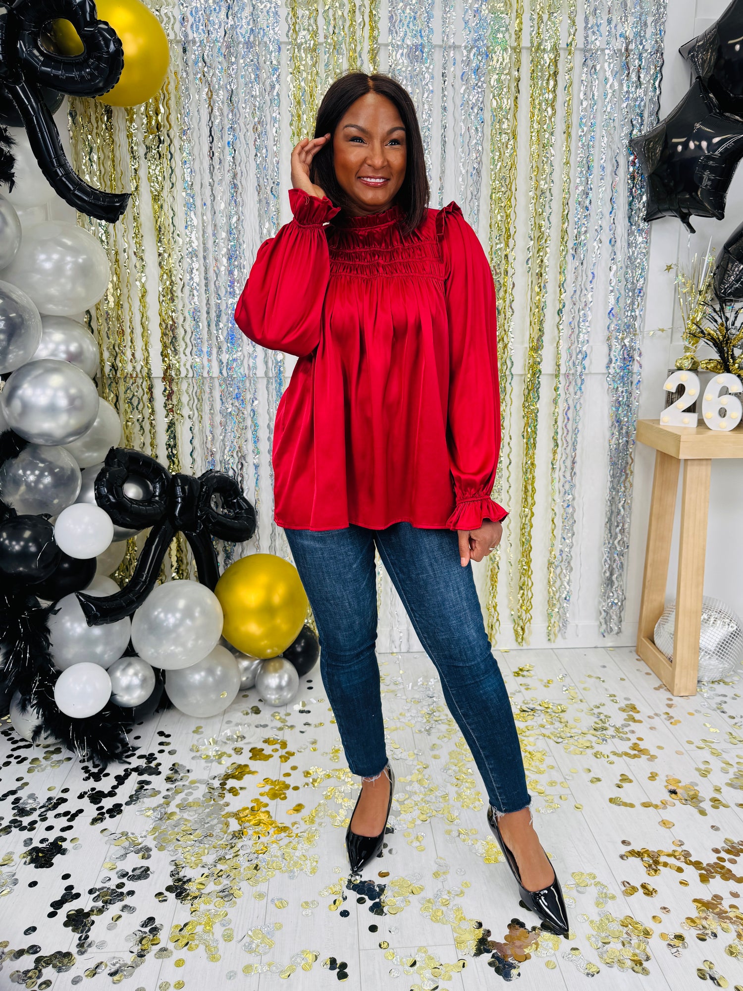 This stunning red blouse features a flattering smocked neckline with ruffle details that add a touch of sophistication. The satin-like finish offers a luxurious feel, while the flowy sleeves with elastic cuffs ensure a relaxed yet stylish silhouette. Perfect for dressy occasions or pairing with your favorite jeans, this top combines elegance and comfort effortlessly.