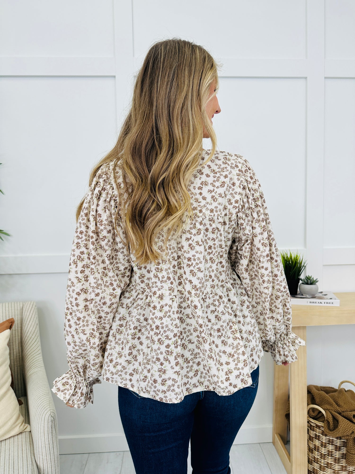 This top features a dainty floral print in chic natural tones that stand out without being overwhelming. The tie-front detail and tiered silhouette creates a flattering shape, while the elastic cuff sleeves add a touch of drama to the relaxed fit. Perfect for pairing with denim, this top is a stylish addition to your wardrobe for any occasion.