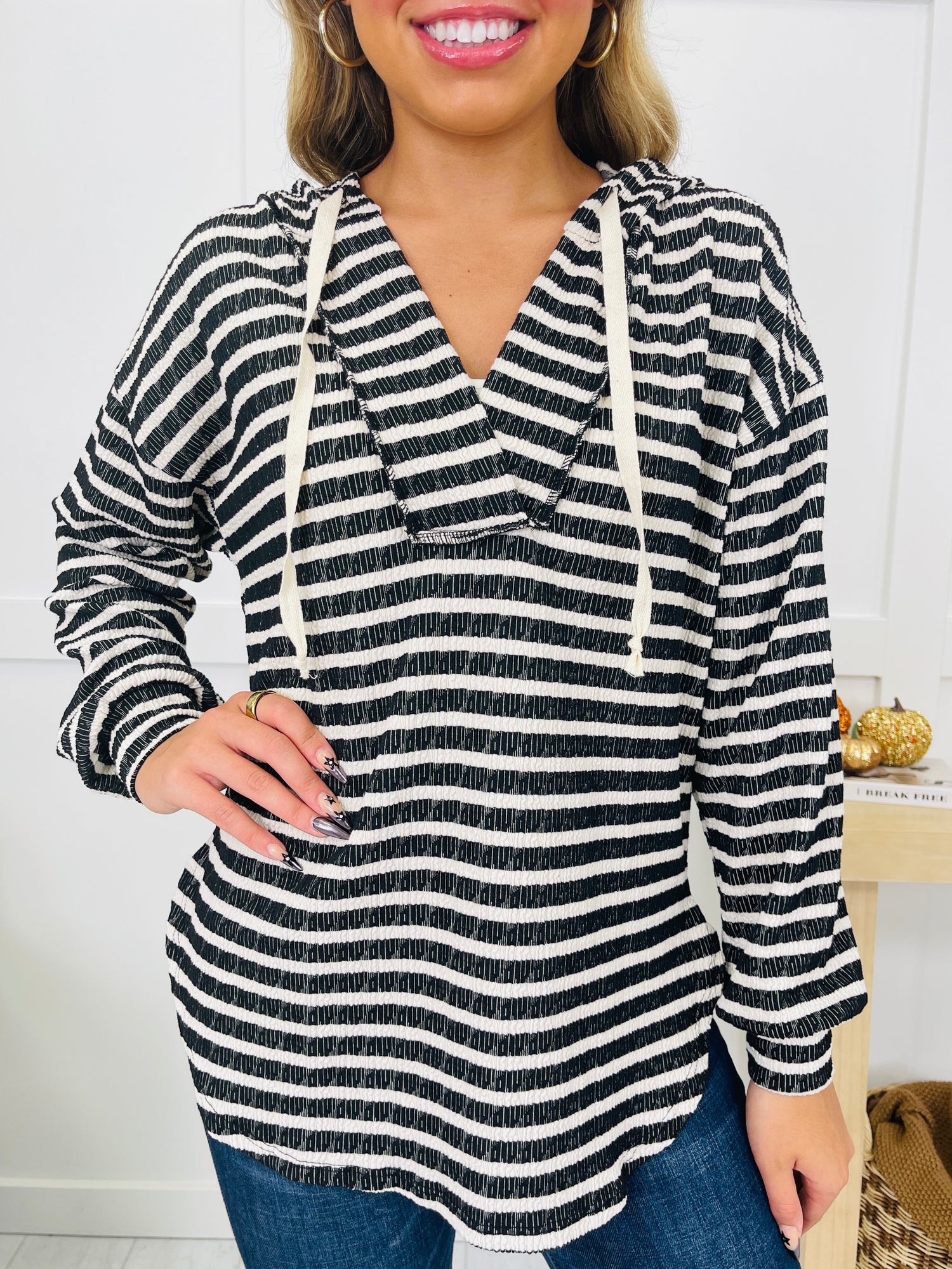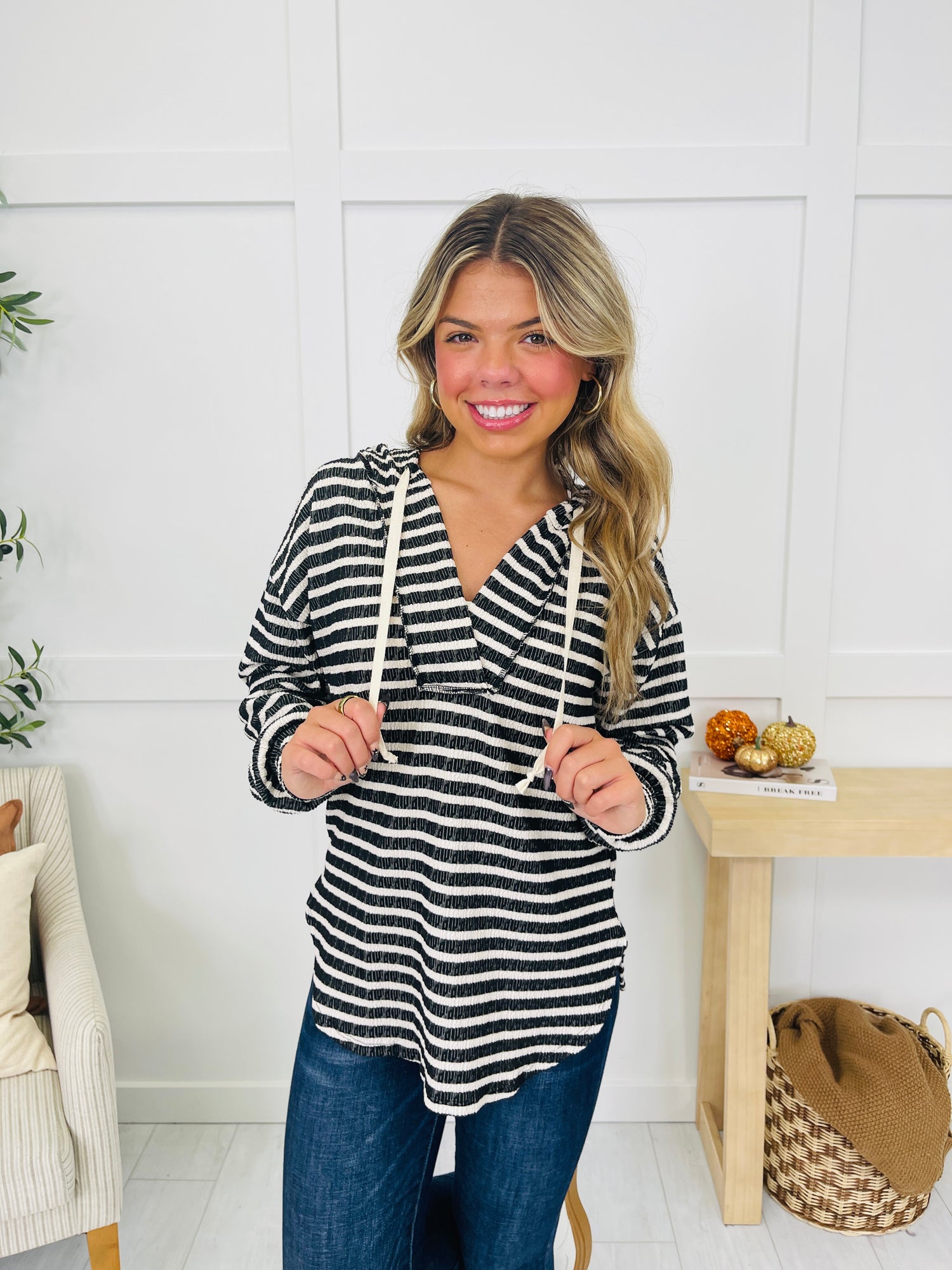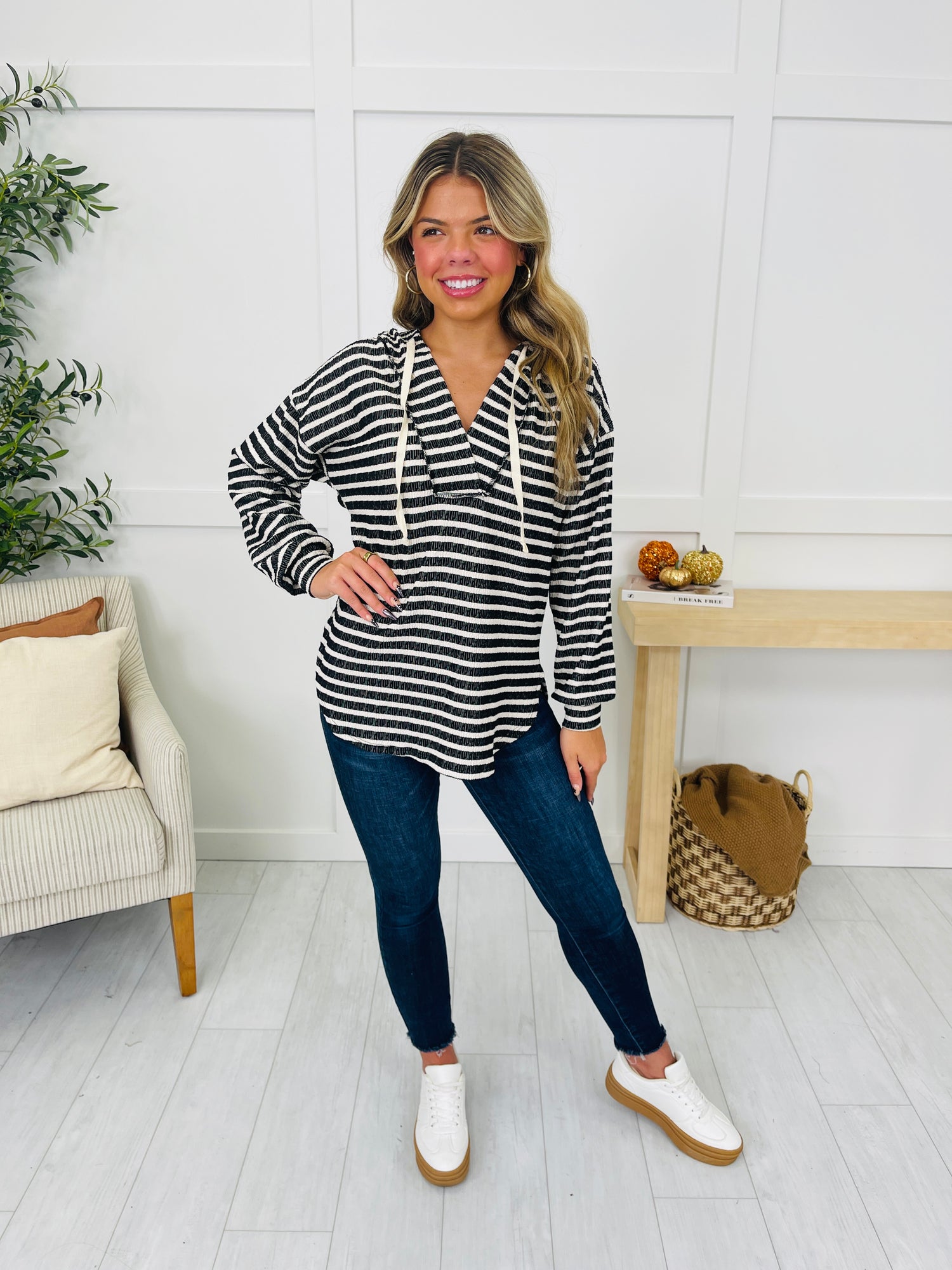 With a relaxed fit and soft fabric, this top features classic black and cream stripes that add a chic, timeless vibe to your look. Finished with a drawstring hood and slightly tapered sleeves, this split neck hoodie is ready to pair with your favorite jeans or leggings for a laid-back yet polished outfit.