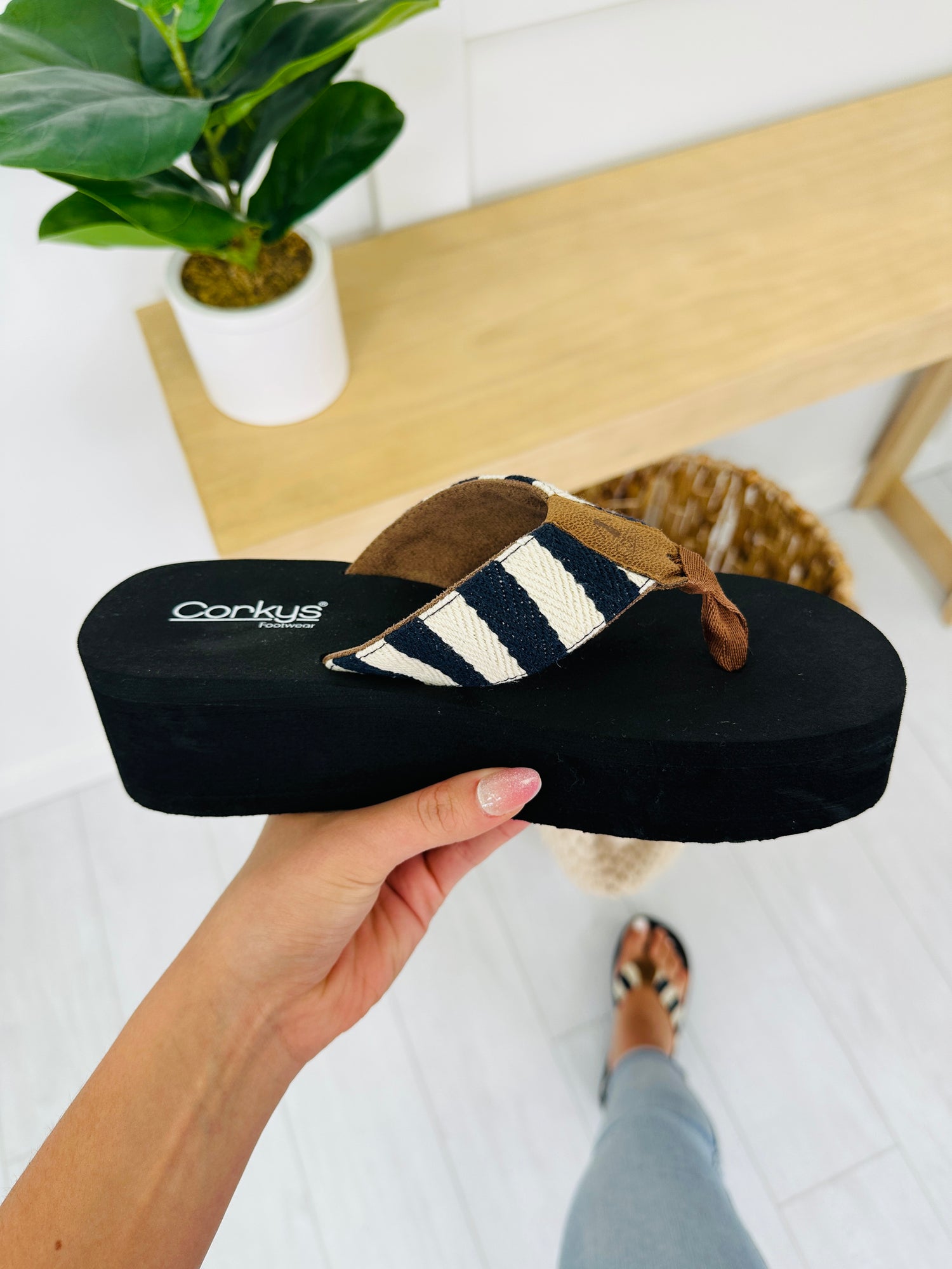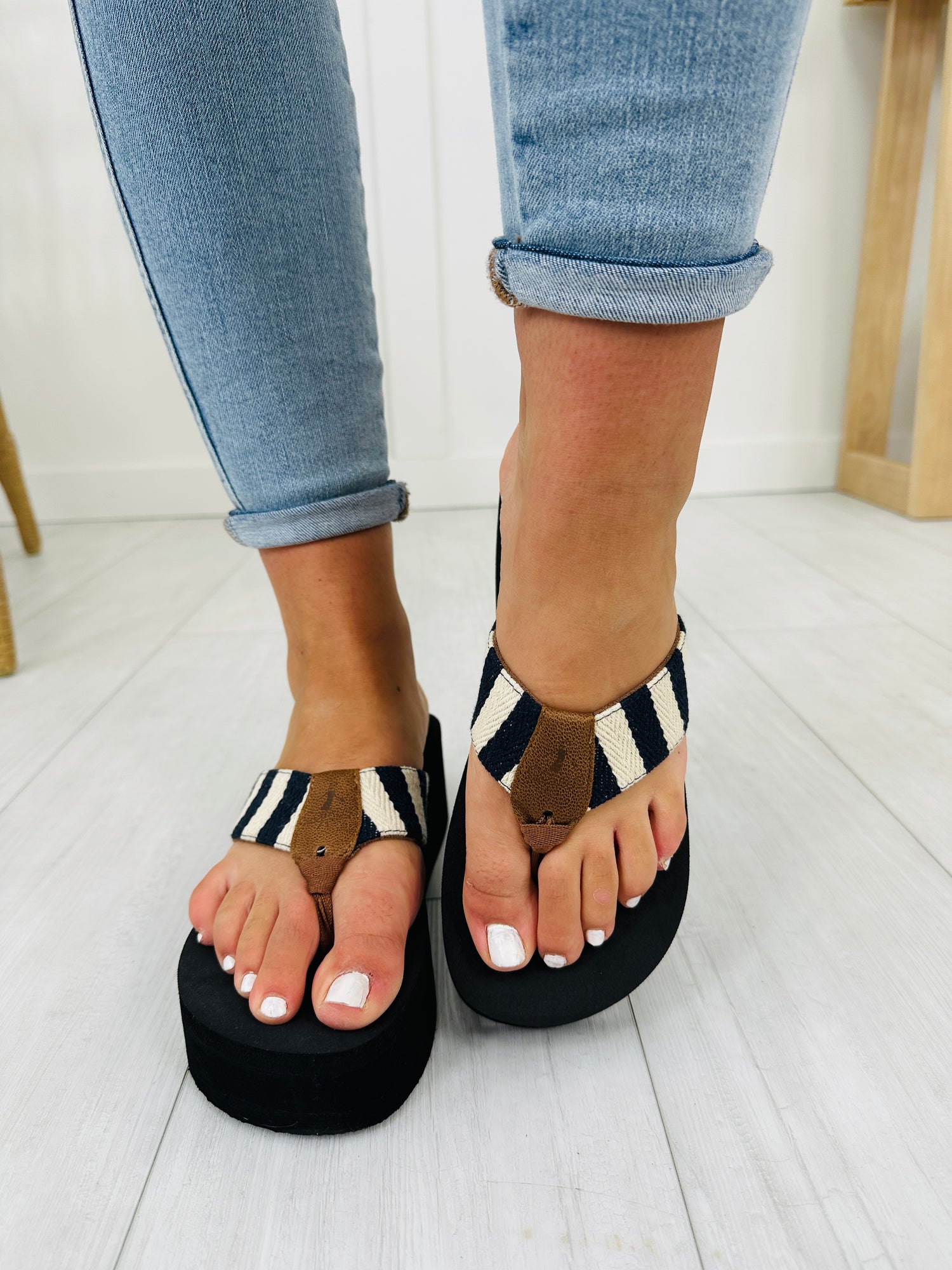 Step into effortless comfort with these fun platform flip flops! Featuring a bold woven strap with eye-catching navy stripes, they bring just the right touch of texture and style to any laid-back look. The cushioned sole and soft foam platform keep you supported and comfy whether you're poolside, beach-bound, or just running errands in style.