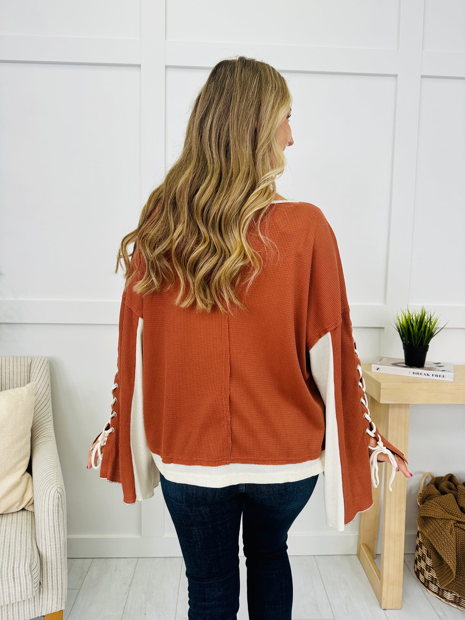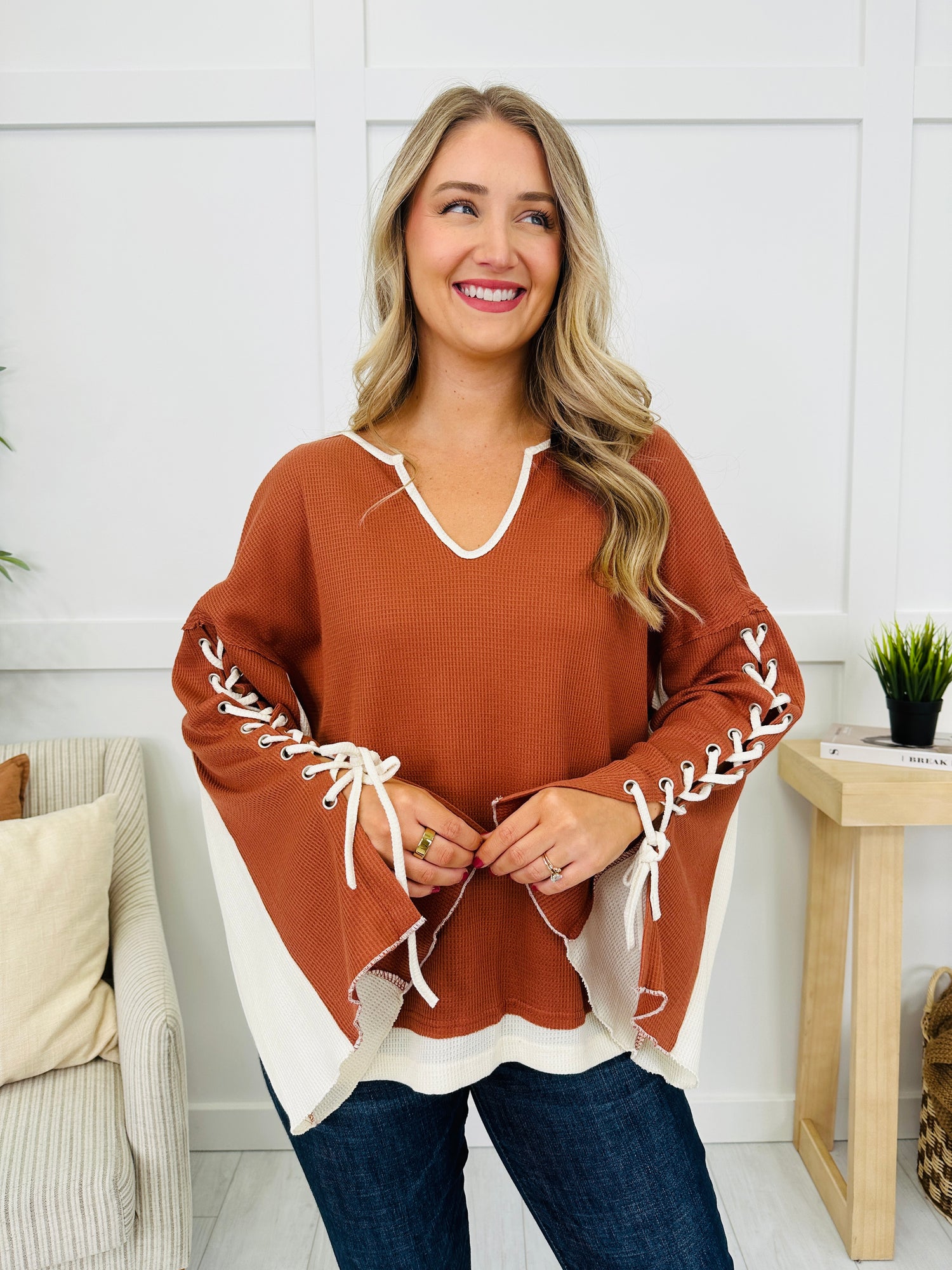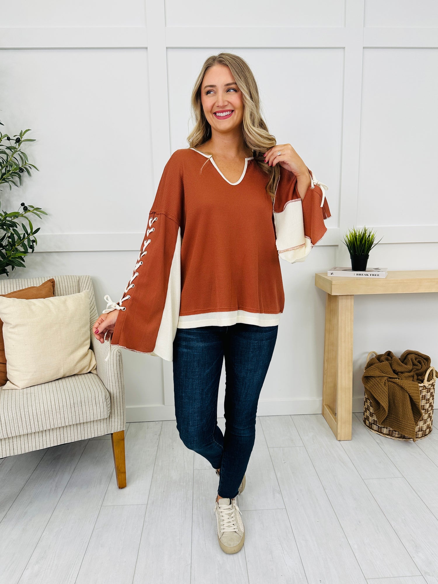 This top brings a fun and unique twist to casual style with its lace-up sleeve detail that instantly stands out. The flowy, wide sleeves add an effortless, relaxed vibe while the contrast trim accents highlight the notched neckline, cuffs, and hem for a polished touch. Perfect for pairing with denim, this piece makes an easy statement while keeping your look playful and chic.