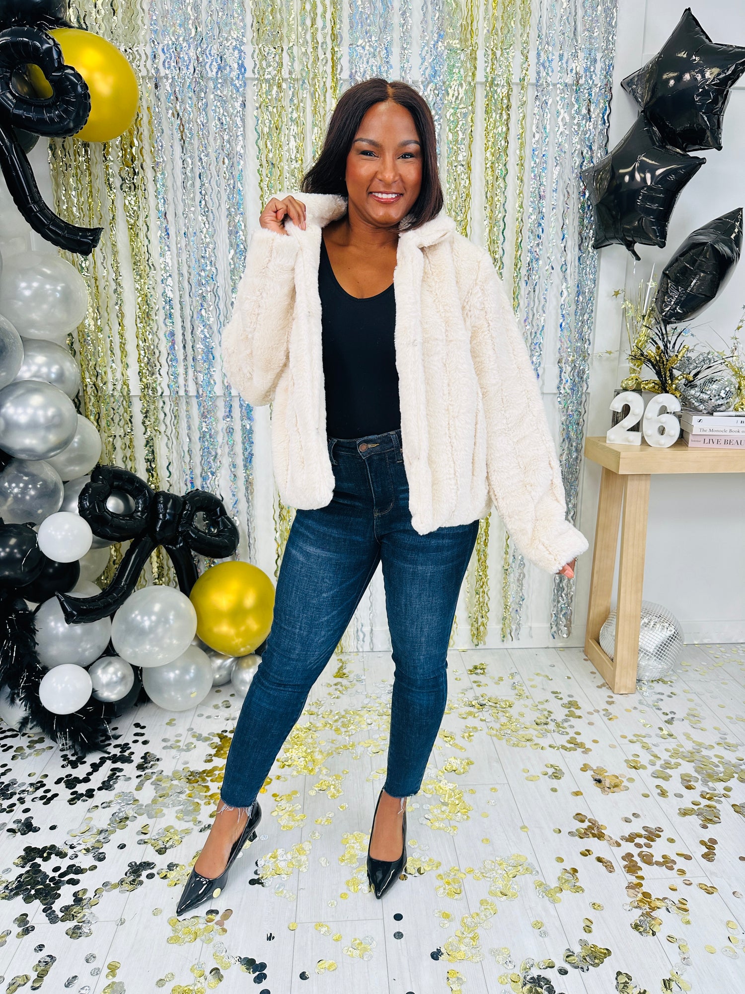 This cozy faux fur jacket is the ultimate in warmth and style, offering a relaxed fit for maximum comfort. The soft, plush texture adds a luxurious touch, while the textured detailing gives it a unique, stylish look. Available in classic black and ivory hues, this jacket is perfect for layering during cooler months, effortlessly elevating any outfit with its chic and cozy appeal..