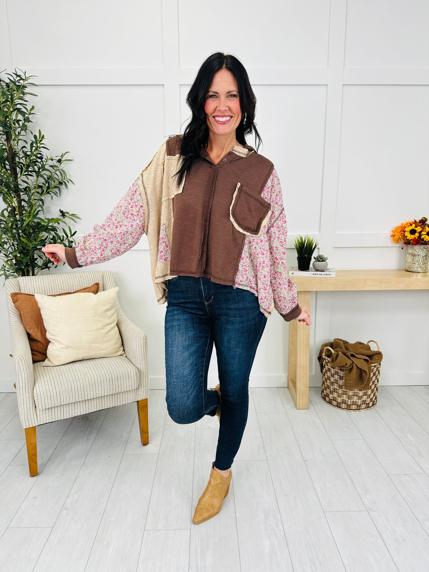 A blend of unexpected textures and patterns gives this top its unique charm. The floral statement sleeves bring a soft, feminine touch, while the mixed fabric design and contrasting stitched accents add depth and detail throughout. With its relaxed silhouette and eye-catching details, this piece makes casual outfits feel effortlessly special.