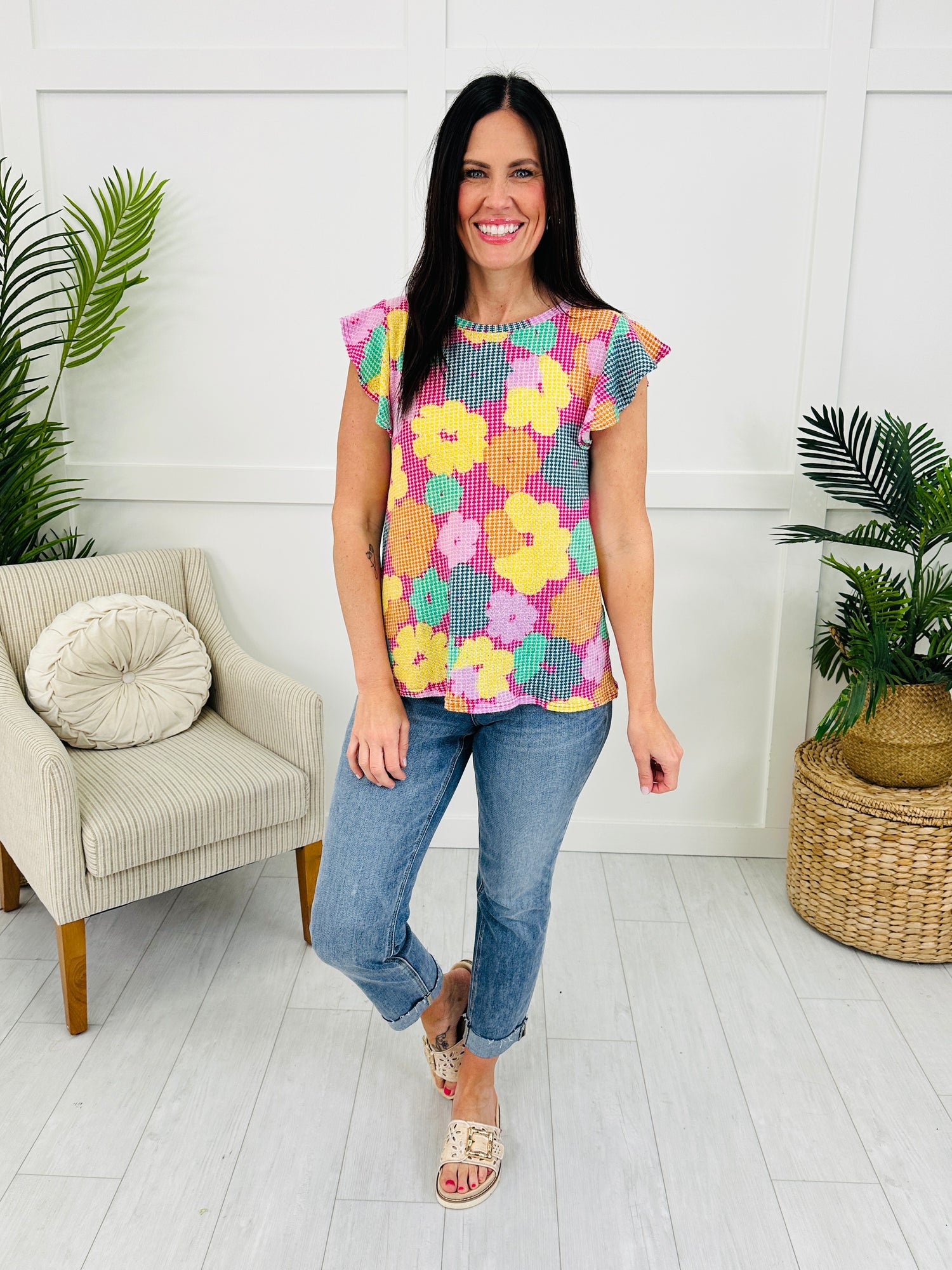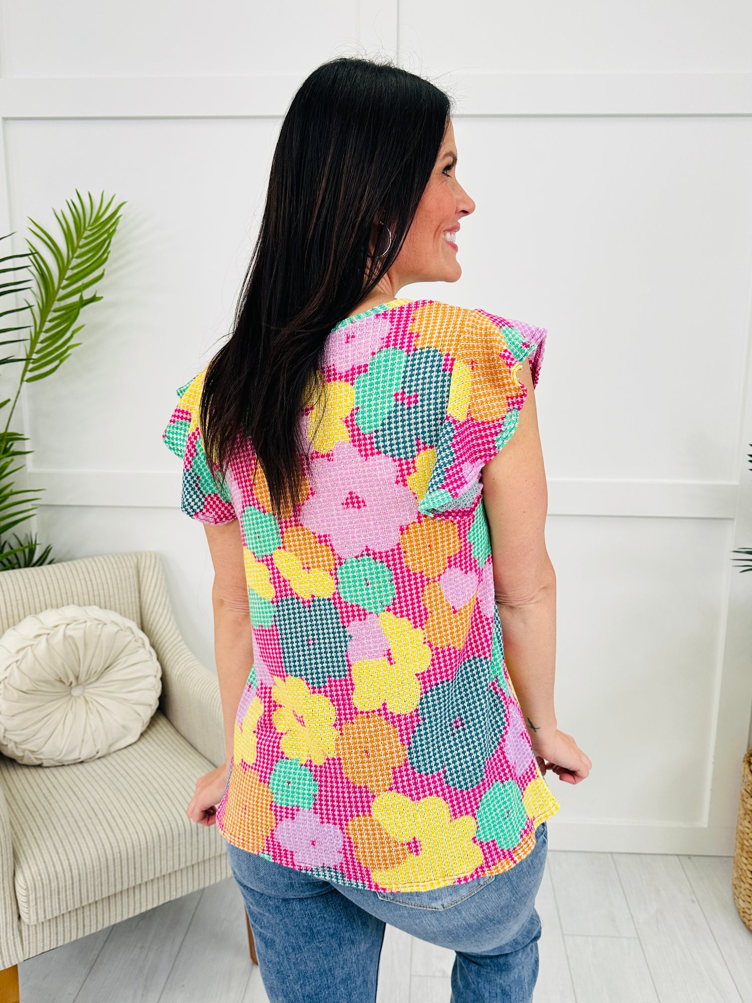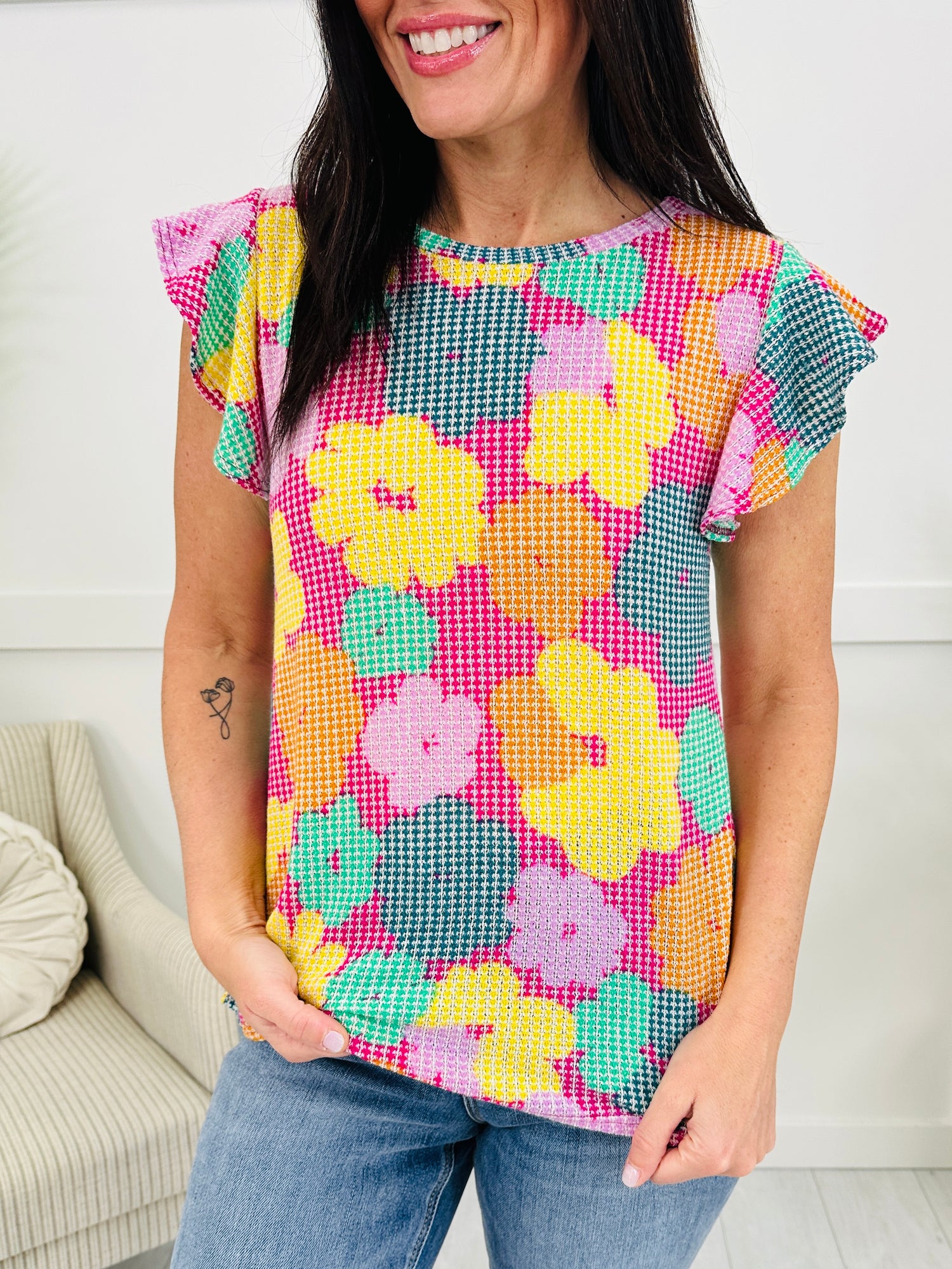 Brighten your day with this playful floral top- featuring fluttery sleeves that add a feminine touch to your look. The textured fabric feels soft and cozy, while the vivid print makes it a standout piece for casual outings or weekend fun. Pair it with your favorite jeans or shorts for effortless, cheerful style.