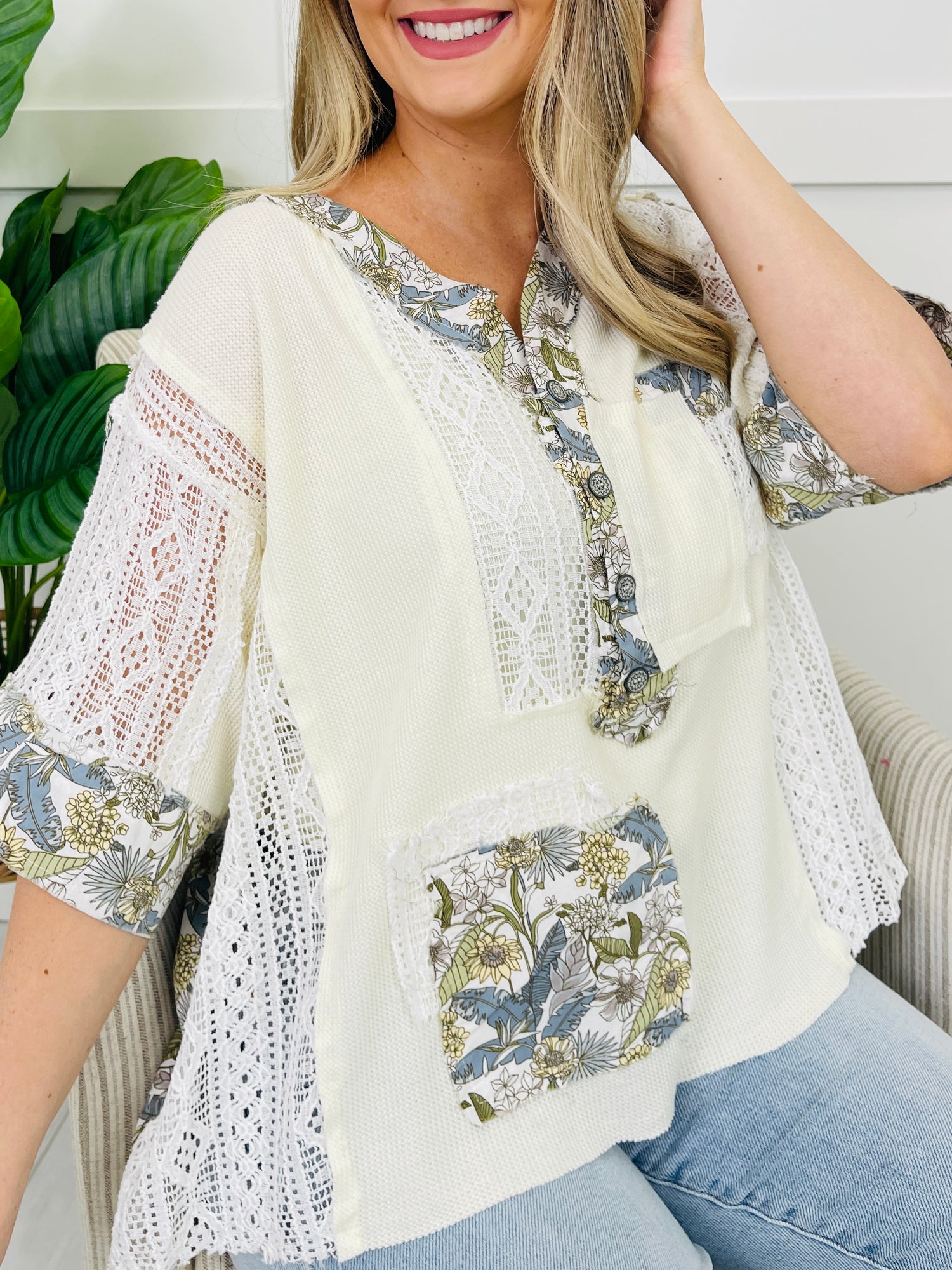 This sweet and breezy top is full of feminine charm with its mixed floral patchwork and soft lace detailing throughout. The textured panels and playful print-blocking give it a boho vibe that feels both casual and elevated. Designed with a relaxed and roomy fit, it’s the perfect pick for easy days with a stylish twist.