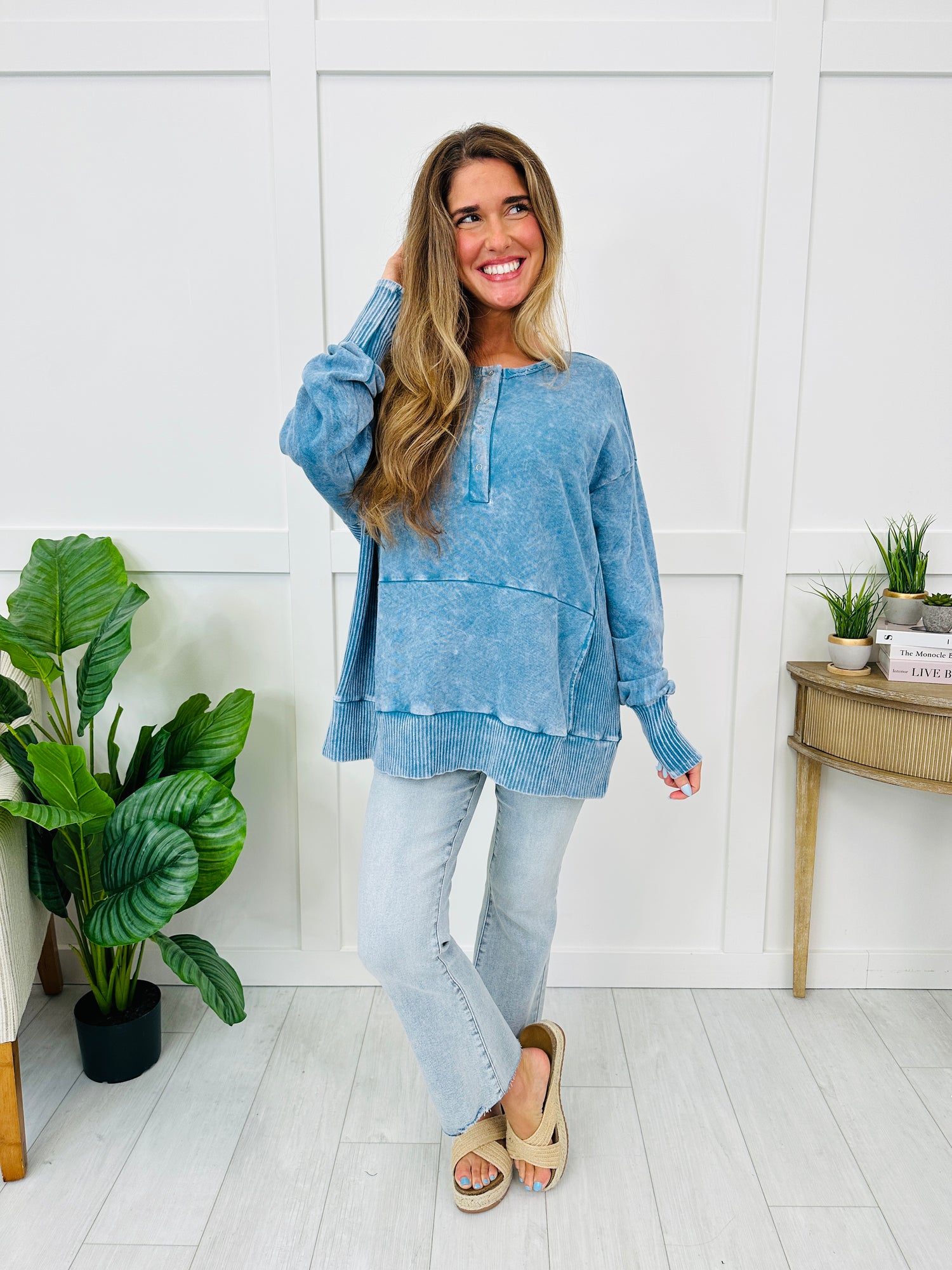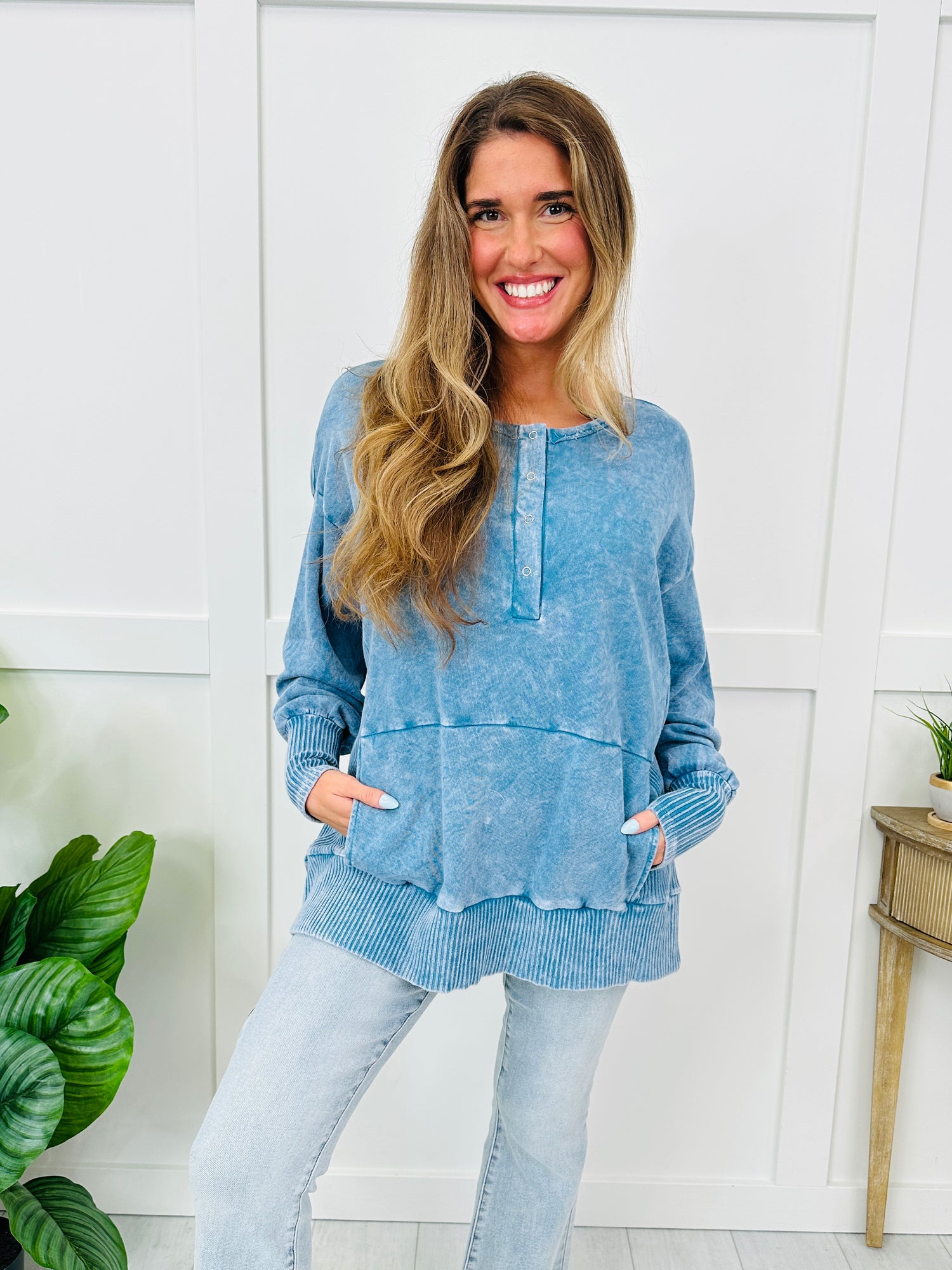 This top brings together casual comfort with a laid-back, lived-in look. The mineral washed finish gives it that soft, vintage-inspired feel, while the snap button placket adds a subtle detail that makes it easy to style. Ribbed trim accents at the hem and cuffs create a cozy contrast, and the relaxed drop shoulder keeps the fit easy and comfortable. It’s the kind of effortless top you can throw on with your favorite denim or leggings for an everyday outfit that still feels stylish and put together.