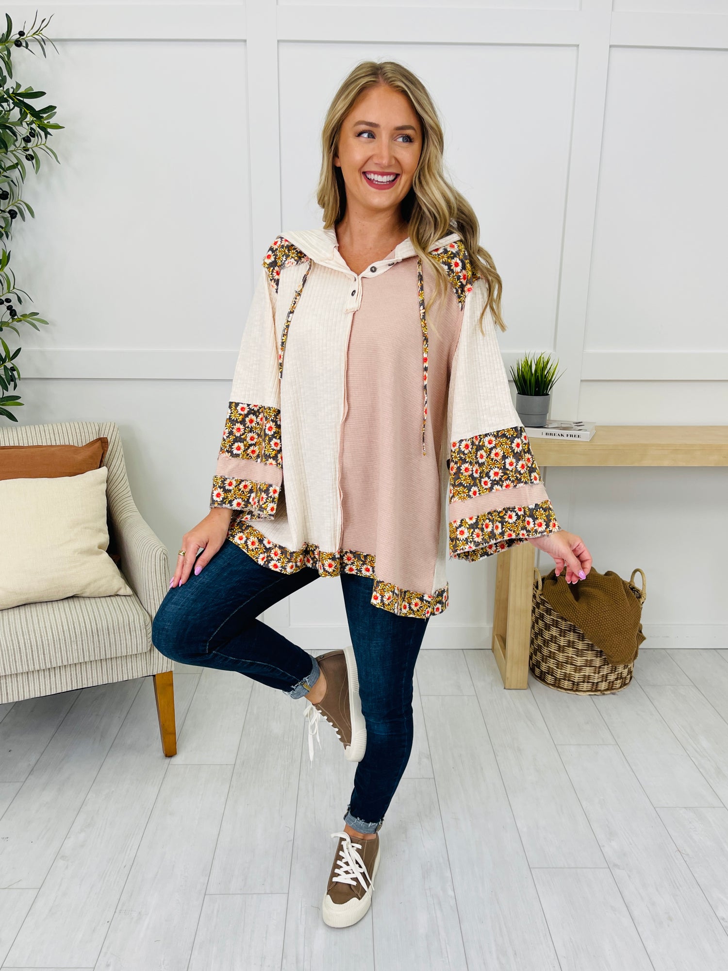 Easygoing and eye-catching, this top pairs a henley neckline with a hood and drawstrings for that casual, sporty vibe. The body features contrasting textured panels that create a soft, color-blocked look, while floral print accents pop at the shoulders, sleeve bands, and hem. Long sleeves and a relaxed, swingy fit make it a throw-on-and-go favorite for laid-back days.