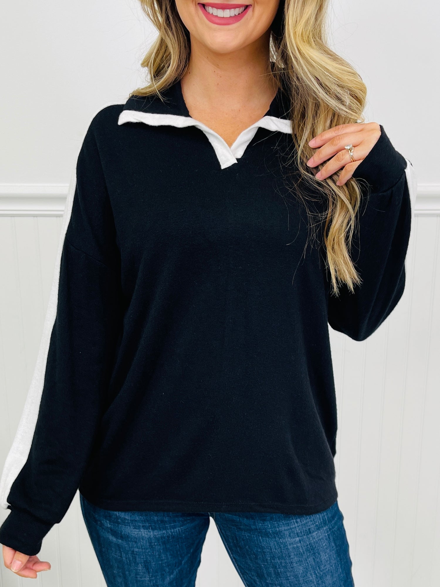 This top blends easy comfort with a sporty touch, thanks to its relaxed shape and bold contrast details. The split collar features a standout light trim that pairs perfectly with the coordinating stripe running down each sleeve. With its laid-back fit and simple, versatile design, this is the kind of everyday piece you’ll reach for again and again.