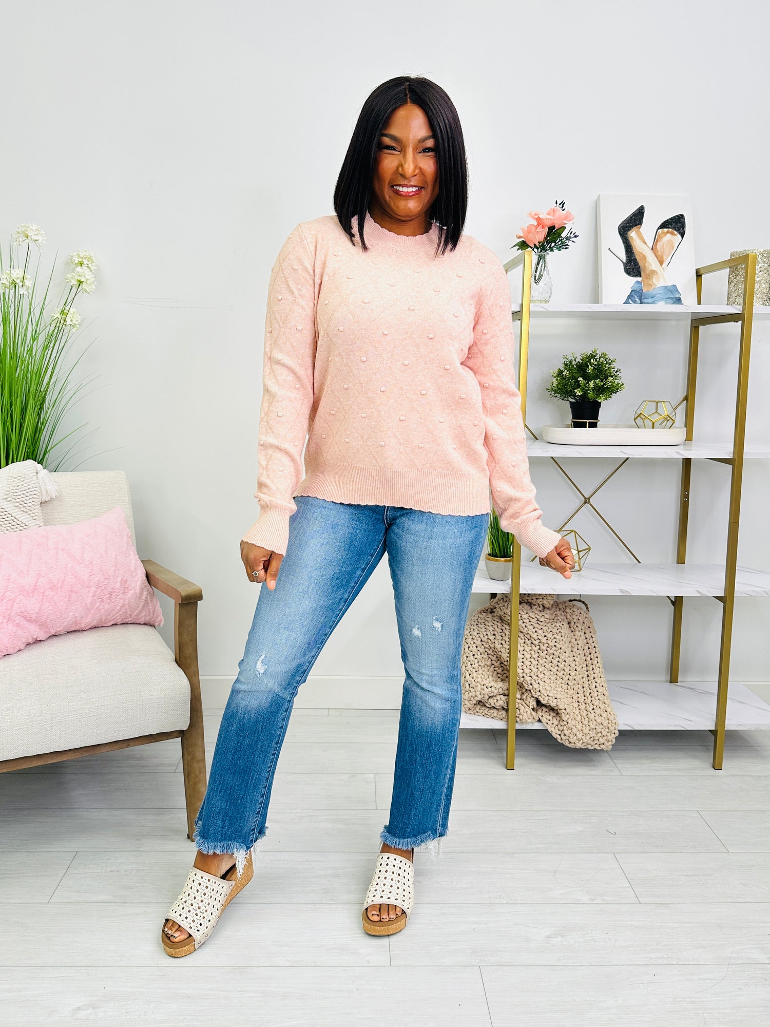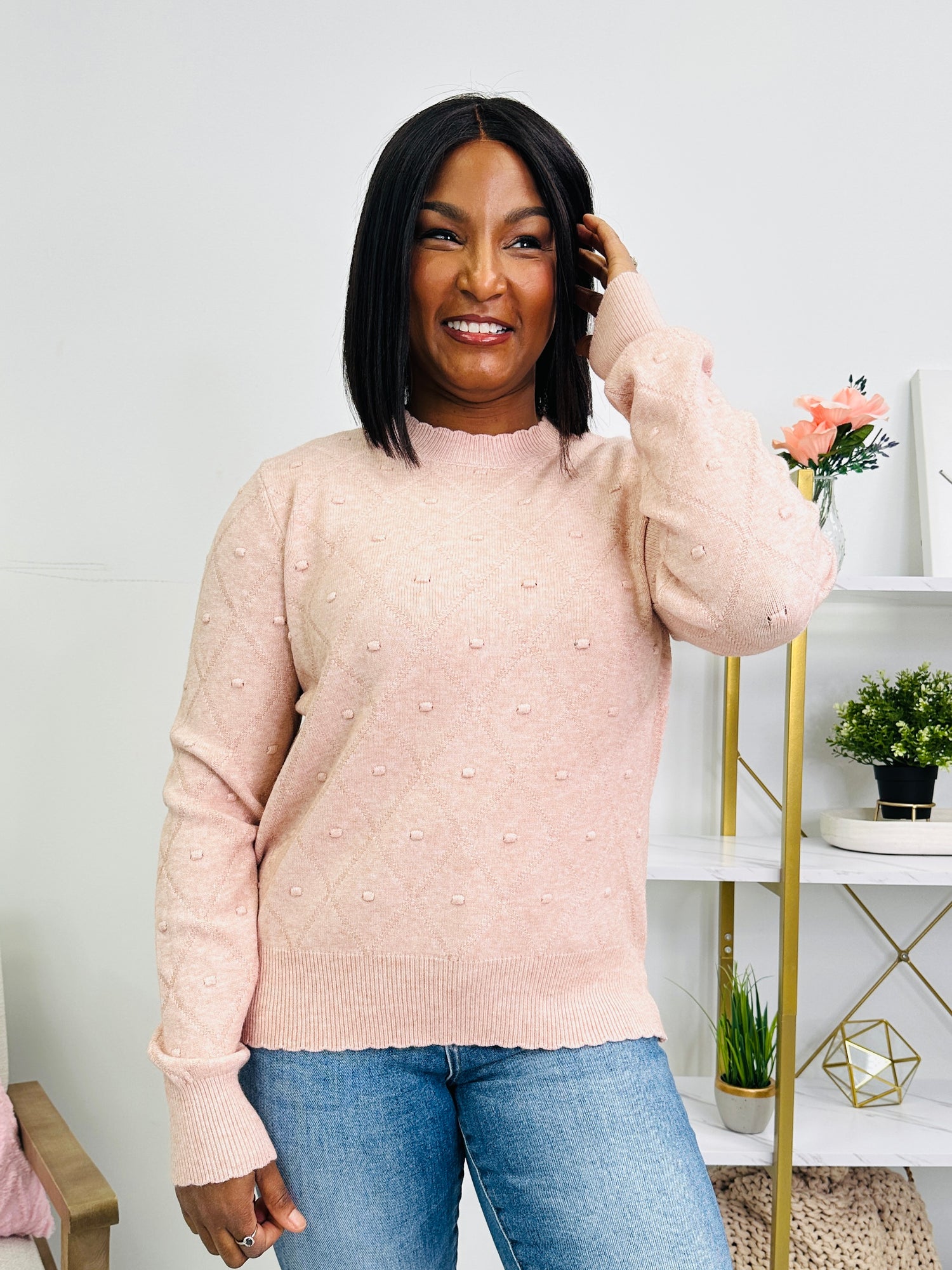This sweater features a beautifully diamond-stitched texture with raised dotted accents that add subtle dimension throughout. The ribbed neckline, cuffs, and hem give it a clean, polished finish, making it an easy piece to style for both casual days and dressed-up moments.