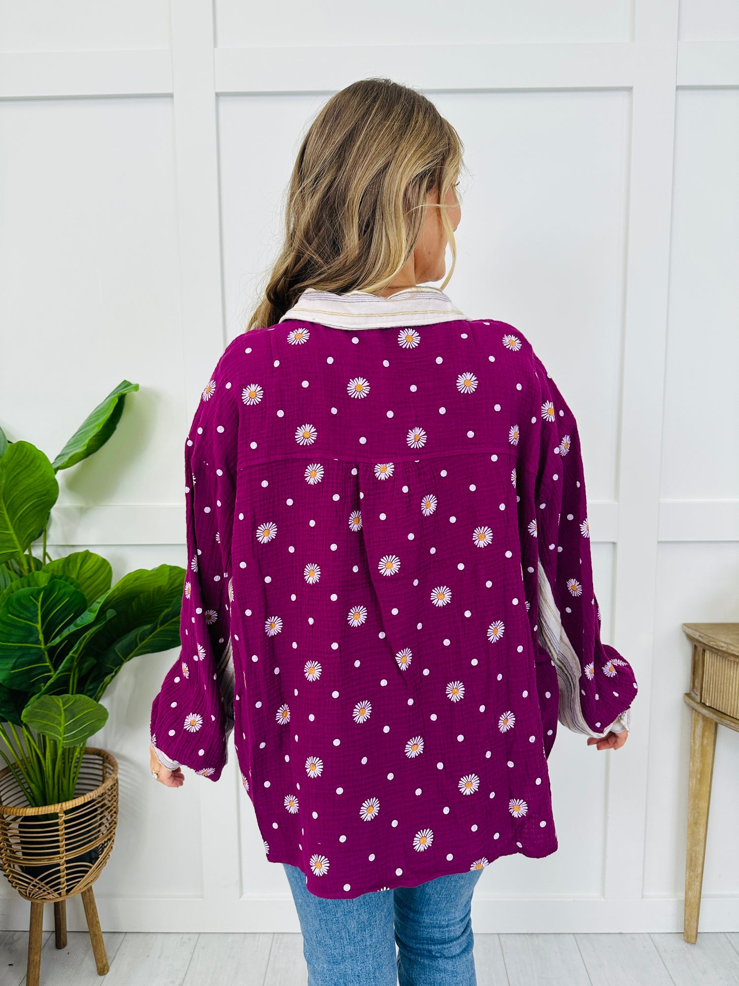 This button-front top features a playful daisy-and-dot print that makes any outfit feel instantly more fun. The striped contrasting trim along the collar, placket, and cuffs adds a cute mixed-pattern touch, while the chest pocket detail finishes the look with an easy, everyday feel. Wear it buttoned up or open over a simple tank for effortless styling.