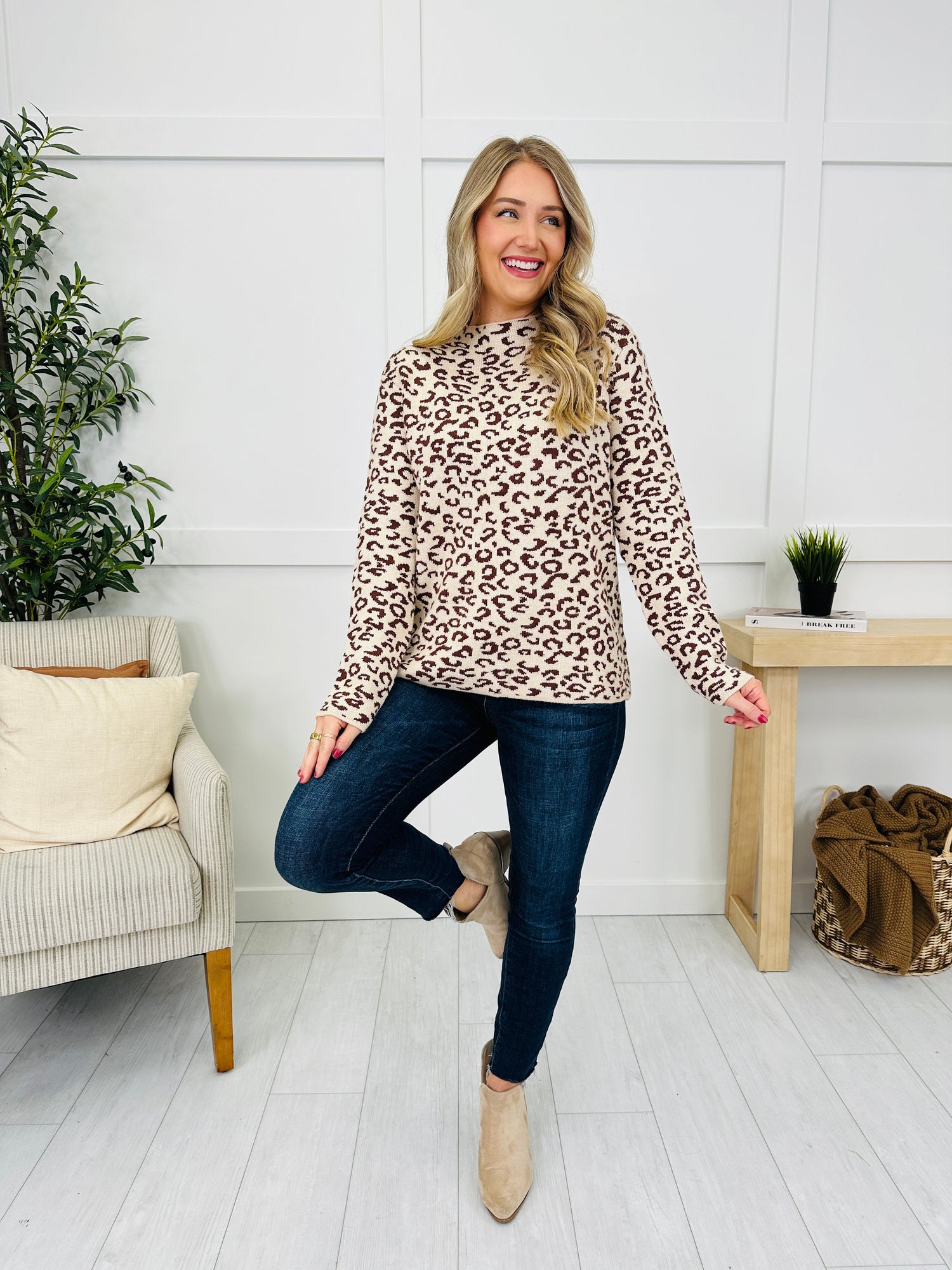This neutral-toned sweater features a bold leopard print pattern in shades of brown, offering a stylish yet comfy vibe. With its slightly relaxed fit, mock neckline, and soft fabric, it’s the perfect cozy piece for layering or wearing on its own. The versatile design pairs effortlessly with your favorite jeans or leggings for an easy, chic look.