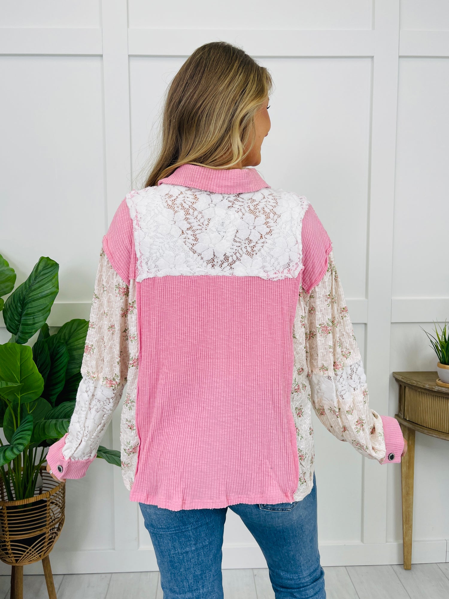 Feminine and fun, this mixed-media button-up is the perfect vintage and trendy blend! Featuring soft corduroy panels, delicate lace, and floral accents, this shacket brings texture and contrast together effortlessly. The relaxed fit and raw hem give it a casually cool vibe, making it a must-have layering piece for any season!