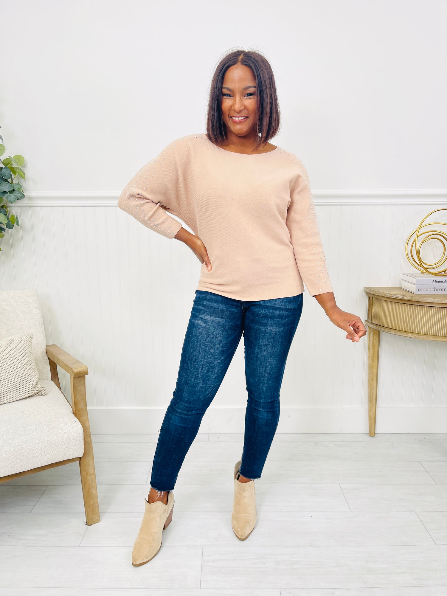 Bring easy elegance to your day with this soft knit top, finished with a graceful boat neckline and a polished straight hem. The sleeves steal the show with sparkling stud embellishments that trail from shoulder to wrist, growing denser toward the cuffs for a subtle gradient effect. A relaxed, bracelet-length sleeve adds a chic touch that pairs perfectly with denim or dress pants.