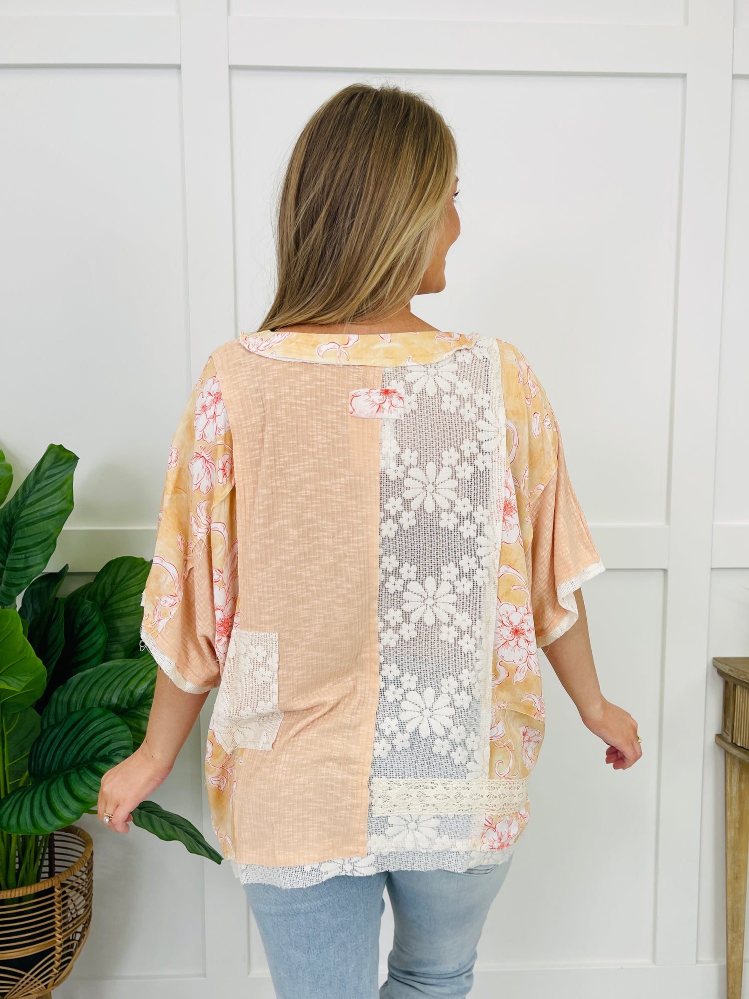 This statement top is full of personality from every angle. The mixed floral and textured panels create a beautifully layered look, while the crochet lace accents add softness and dimension throughout. The studded chest pocket detail brings in a subtle edge, perfectly balancing the feminine prints. Finished with a relaxed, flowy silhouette, this piece pairs effortlessly with denim for an easy outfit that still feels special and thoughtfully styled.